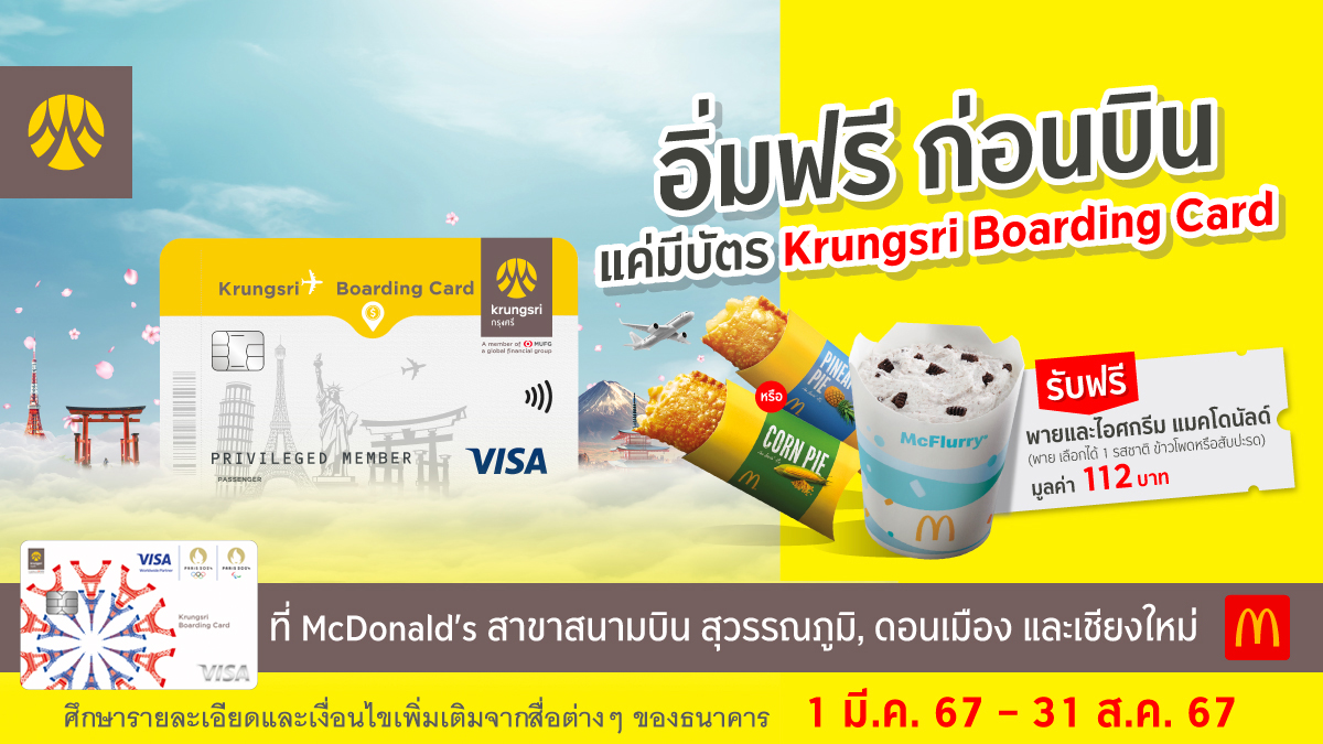 กรุงเทพฯ (22 มีนาคม 2567) – กรุงศรี (ธนาคารกรุงศรีอยุธยา จำกัด (มหาชน)) มอบสิทธิพิเศษสำหรับลูกค้าผู้ถือบัตร Krungsri Boarding Card ให้อิ่มฟรี ก่อนบิน เพียงแค่สมัครและเปิดใช้บัตร (Activate card) ก่อนวันที่ 1 มีนาคม 2567 และยังคงสถานะการใช้งานอยู่ รับฟรี พายข้าวโพด หรือพายสับปะรด และไอศกรีม ที่แมคโดนัลด์สาขาสนามบิน สุวรรณภูมิ สนามบินดอนเมือง และสนามบินเชียงใหม่ รวมมูลค่า 112 บาท โดยสามารถกดรับสิทธิ์ผ่าน KMA krungsri app เมนู GIFT & Privileges พร้อมแสดงบัตร Krungsri Boarding Card เพื่อรับสิทธิ์กับพนักงานของแมคโดนัลด์ ได้ตั้งแต่วันที่ 1 มีนาคม 2567 – 31 สิงหาคม 2567
