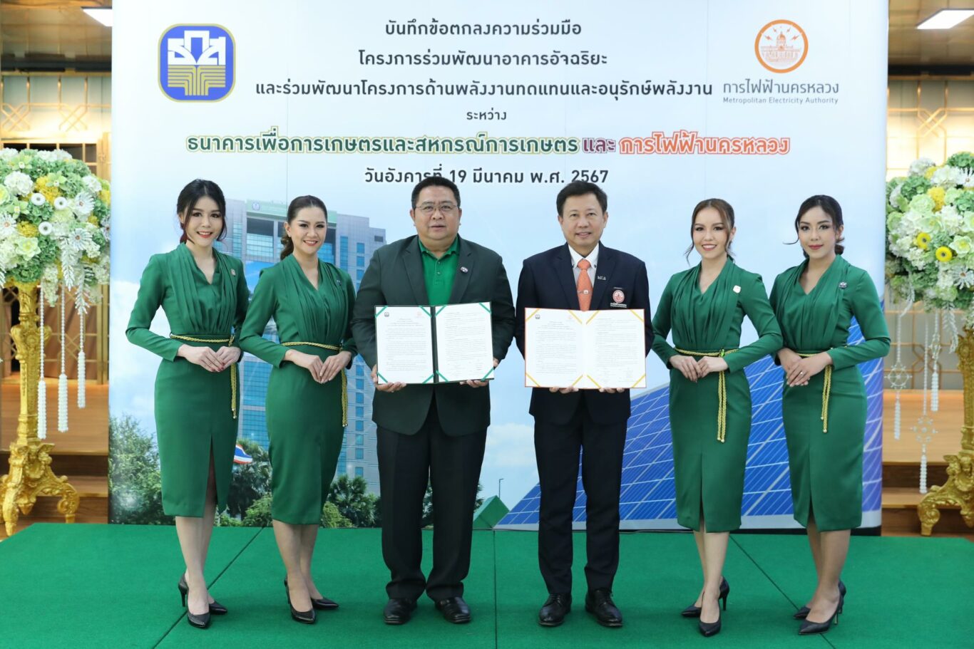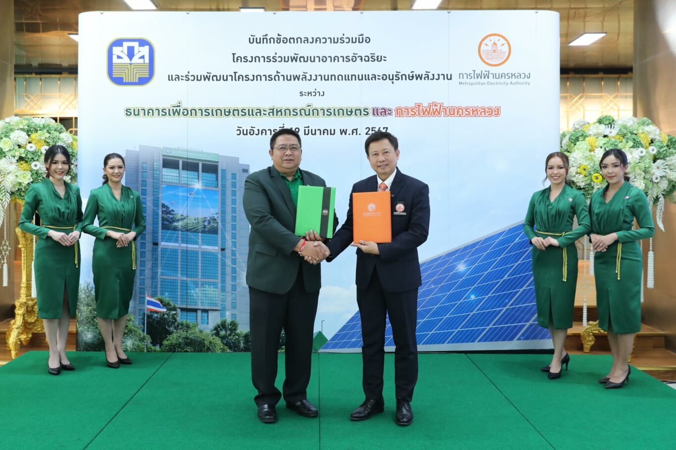 นายเชษฐา แหล่ป้อง รองผู้จัดการธนาคารเพื่อการเกษตรและสหกรณ์การเกษตร (ธ.ก.ส.) และ นายจาตุรงค์ สุริยาศศิน รองผู้ว่าการธุรกิจการไฟฟ้านครหลวง ร่วมลงนามบันทึกข้อตกลงความร่วมมือโครงการร่วมพัฒนาอาคารอัจฉริยะและการพัฒนาโครงการด้านพลังงานและอนุรักษ์พลังงาน เพื่อส่งเสริมและสนับสนุนการใช้พลังงานอย่างยั่งยืน (Sustainable Development Goals)