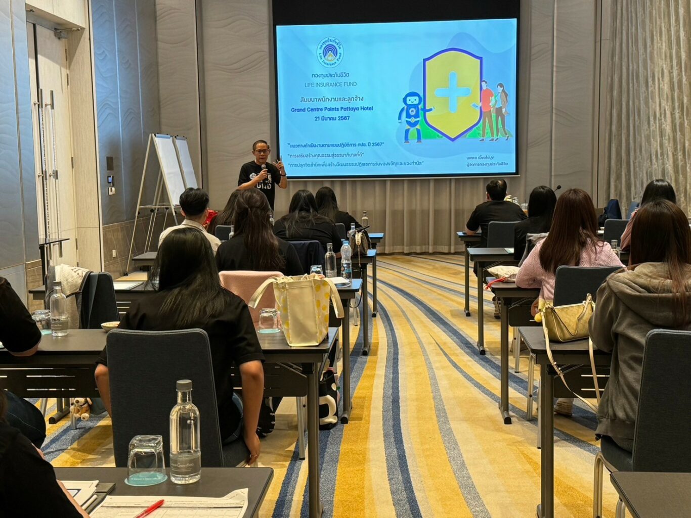 เมื่อวันที่ 21 มีนาคม 2567 กองทุนประกันชีวิตจัดโครงการสัมมนาเชิงปฏิบัติการเพื่อขับเคลื่อนยุทธศาสตร์ และส่งเสริมจริยธรรมธรรมาภิบาลภายในองค์กร บรรยายโดย นายนพพล เบี้ยวไข่มุข ผู้จัดการกองทุนประกันชีวิต ณ โรงแรม Grande Centre Point Pattaya จังหวัดชลบุรี เพื่อสร้างความเข้าใจแก่บุคลากรของกองทุนประกันชีวิตให้เป็นไปในทิศทางเดียวกันในการดำเนินงานและร่วมกันผลักดันให้แผนงานของกองทุนฯ บรรลุวัตถุประสงค์และเป้าหมายที่กำหนดไว้ตามแผนปฏิบัติการกองทุนประกันชีวิต ประจำปี 2567 รวมถึงเสริมสร้างความสัมพันธ์ในการทำงานร่วมกันเป็นทีมผ่านการทำกิจกรรม Work Shop ร่วมกัน และสร้างวัฒนธรรมองค์กรแก่บุคลากรตามมาตรฐานจริยธรรม เพิ่มศักยภาพในการทำงานร่วมกันภายในองค์กรให้เกิดประสิทธิภาพมากยิ่งขึ้นโดยยึดหลักธรรมภิบาลที่ดีและการครองตนตามมาตรฐานจริยธรรมพนักงานหน่วยงานรัฐ