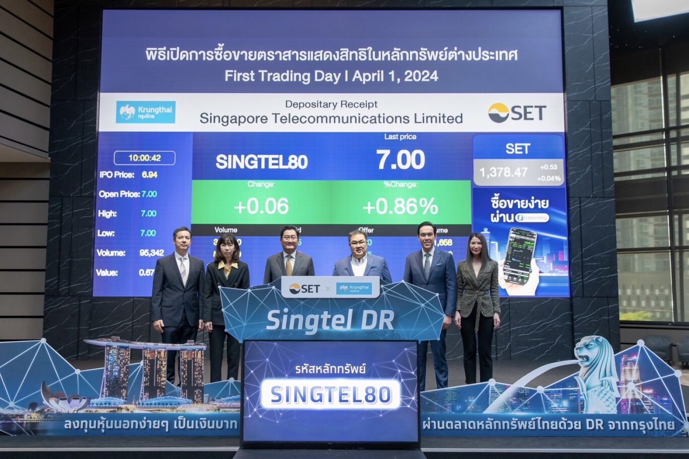 นายอารภัฏ สังขรัตน์ (ซ้ายสุด) ประธานเจ้าหน้าที่บริหาร และ นางสาวนลิน วิริยะเสถียร (ขวาสุด) รองกรรมการผู้จัดการอาวุโส ฝ่ายวาณิชธนกิจ บริษัทหลักทรัพย์ เมย์แบงก์ (ประเทศไทย) จำกัด (มหาชน) ในฐานะผู้จัดการการจำหน่ายและรับประกันการจำหน่ายเพียงผู้เดียว ร่วมแสดงความยินดีกับ นายรวินทร์ บุญญานุสาสน์ (ที่สามจากขวา) ผู้บริหารสายงานธุรกิจตลาดเงินตลาดทุน และ นายกฤชกร นนทะนาคร (ที่สองจากขวา) Head of Debt Capital Market & Investment Banking ธนาคารกรุงไทย จำกัด (มหาชน) ในพิธีเปิดการซื้อขายเป็นวันแรกของตราสารแสดงสิทธิในหลักทรัพย์ต่างประเทศ ตราสารแสดงสิทธิในหุ้นต่างประเทศของบริษัท Singapore Telecommunications Limited (Singtel) ที่ออกโดยธนาคารกรุงไทย จำกัด (มหาชน) ในชื่อย่อหลักทรัพย์ “SINGTEL80” ณ ตลาดหลักทรัพย์แห่งประเทศไทย เมื่อวันที่ 1 เมษายน 2567 ที่ผ่านมา