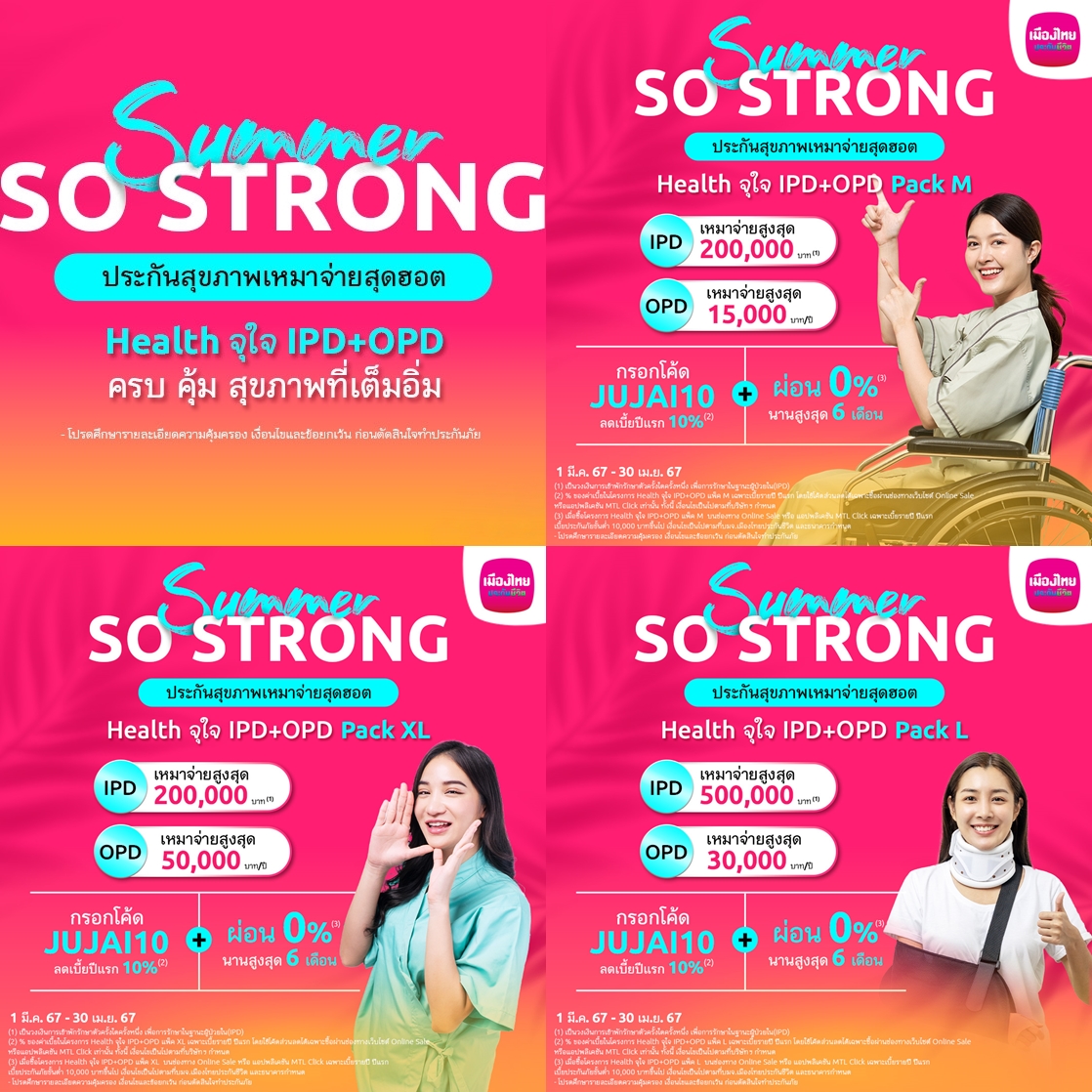 เมืองไทยประกันชีวิต ส่งประกันสุขภาพเหมาจ่ายสุดฮอต “Health จุใจ IPD+OPD” จัดแคมเปญ Summer So Strong ช่วยเพิ่มความอุ่นใจ หายห่วงเรื่องค่ารักษา พร้อมสิทธิพิเศษสุดคุ้มถึง 2 ต่อ เพียงกรอกโค้ด “JUJAI10” และเลือกผ่อนได้ 0% นานสูงสุดถึง 6 เดือน พร้อมรับความสุขและความอุ่นใจได้แล้วตั้งแต่ 1 มีนาคม – 30 เมษายน 2567