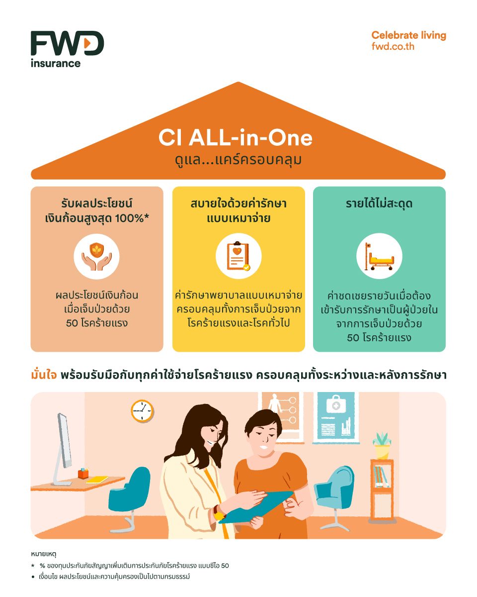 FWD ประกันชีวิต เปิดตัว “CI ALL-in-One” แบบประกันโรคร้ายแรงแพ็กเกจเดียวคุ้มครองครบทุกความกังวลพร้อมรับผลประโยชน์เงินก้อนเมื่อตรวจพบ 50 โรคร้ายแรง และดูแลต่อเนื่อง ทั้งในช่วงระหว่าง จนถึงหลังการรักษา ด้วยความคุ้มครองค่ารักษาพยาบาลแบบเหมาจ่าย สำหรับการเจ็บป่วยจากโรคร้ายแรง โรคทั่วไป และอุบัติเหตุ พร้อมค่าชดเชยรายวันเมื่อรับการรักษาแบบผู้ป่วยในจากการเจ็บป่วยด้วย 50 โรคร้ายแรง