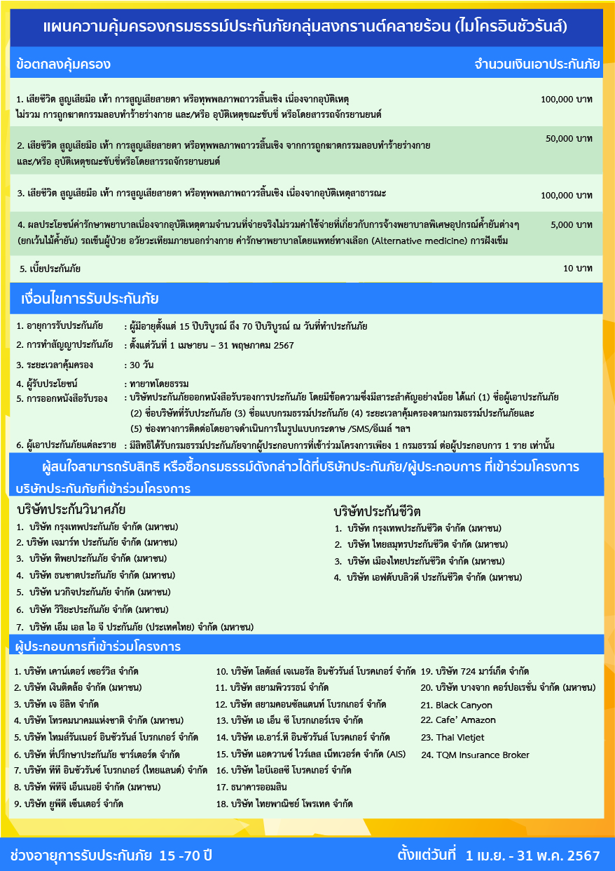 ในโอกาสนี้ สำนักงาน คปภ. ภาคธุรกิจประกันภัย และเครือข่ายพันธมิตรภาคธุรกิจ ได้ร่วมใจกันส่งมอบของขวัญในช่วงเทศกาลสงกรานต์ปี 2567 ให้กับประชาชนผ่านกรมธรรม์ 2 กรมธรรม์ คือ กรมธรรม์แรก กรมธรรม์ประกันภัยกลุ่มสงกรานต์คลายร้อน (ไมโครอินชัวรันส์) เบี้ยประกันภัย 10 บาท โดยผู้เอาประกันภัยต้องมีอายุตั้งแต่ 15 ถึง 70 ปีบริบูรณ์ ณ วันที่ทำประกันภัย ระยะเวลาคุ้มครอง 30 วัน ตั้งแต่วันที่ 1 เมษายน 2567 ถึงวันที่ 31 พฤษภาคม 2567 โดยให้ความคุ้มครองหลัก ได้แก่ 1. กรณีเสียชีวิต การสูญเสียมือ เท้า การสูญเสียสายตา หรือทุพพลภาพถาวรสิ้นเชิง เนื่องจากอุบัติเหตุ ไม่รวม การถูกฆาตกรรมลอบทำร้ายร่างกาย และ/หรือ อุบัติเหตุขณะขับขี่ หรือโดยสารรถจักรยานยนต์ จำนวนเงินเอาประกันภัย 100,000 บาท 2. กรณีเสียชีวิต การสูญเสียมือ เท้า การสูญเสียสายตา หรือทุพพลภาพถาวรสิ้นเชิง จากการถูกฆาตกรรมลอบทำร้ายร่างกาย และ/หรือ อุบัติเหตุขณะขับขี่หรือโดยสารรถจักรยานยนต์ จำนวนเงินเอาประกันภัย 50,000 บาท 3. กรณีเสียชีวิต การสูญเสียมือ เท้า การสูญเสียสายตาหรือทุพพลภาพถาวรสิ้นเชิงเนื่องจากอุบัติเหตุสาธารณะ จำนวนเงินเอาประกันภัย 100,000 บาท 4. ผลประโยชน์ค่ารักษาพยาบาลเนื่องจากอุบัติเหตุตามจำนวนที่จ่ายจริง ไม่รวม ค่าใช้จ่ายที่เกี่ยวกับการจ้างพยาบาลพิเศษอุปกรณ์ค้ำยันต่าง ๆ (ยกเว้นไม้ค้ำยัน) รถเข็นผู้ป่วย อวัยวะเทียมภายนอกร่างกาย ค่ารักษาพยาบาลโดยแพทย์ทางเลือก (Alternative medicine) การฝังเข็ม จำนวนเงินเอาประกันภัย 5,000 บาท