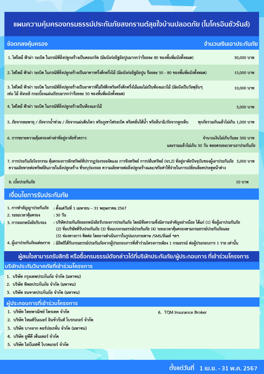 กรมธรรม์ที่สอง คือ กรมธรรม์ประกันสงกรานต์สุขใจบ้านปลอดภัย (ไมโครอินชัวรันส์) เบี้ยประกันภัย 10 บาท โดยมีระยะเวลาคุ้มครอง 30 วัน ตั้งแต่วันที่ 1 เมษายน 2567 ถึงวันที่ 31 พฤษภาคม 2567 สำหรับรายละเอียดความคุ้มครอง ได้แก่ 1. กรณีที่อยู่อาศัยได้รับความเสียหายจากไฟไหม้ ฟ้าผ่า ระเบิด ในกรณีที่สิ่งปลูกสร้างเป็นคอนกรีต (มีผนังก่ออิฐถือปูนมากกว่าร้อยละ 80 ของพื้นที่ผนังทั้งหมด) ได้รับความคุ้มครอง 30,000 บาท 2. กรณีที่อยู่อาศัยได้รับความเสียหายจากไฟไหม้ ฟ้าผ่า ระเบิด ในกรณีที่สิ่งปลูกสร้างเป็นอาคารครึ่งตึกครึ่งไม้ (มีผนังก่ออิฐถือปูนร้อยละ 50-80 ของพื้นที่ผนังทั้งหมด) ได้รับความคุ้มครอง 15,000 บาท 3. กรณีที่อยู่อาศัยได้รับความเสียหายจากไฟไหม้ ฟ้าผ่า ระเบิด ในกรณีที่สิ่งปลูกสร้างเป็นอาคารที่ไม่ใช่ตึกหรือครึ่งตึกครึ่งไม้และไม่เป็นห้องแถวไม้ (มีผนังเป็นวัสดุอื่น ๆ เช่น ไม้ สังกะสี กระเบื้องแผ่นเรียบมากกว่าร้อยละ 50 ของพื้นที่ผนังทั้งหมด) ได้รับความคุ้มครอง 10,000 บาท