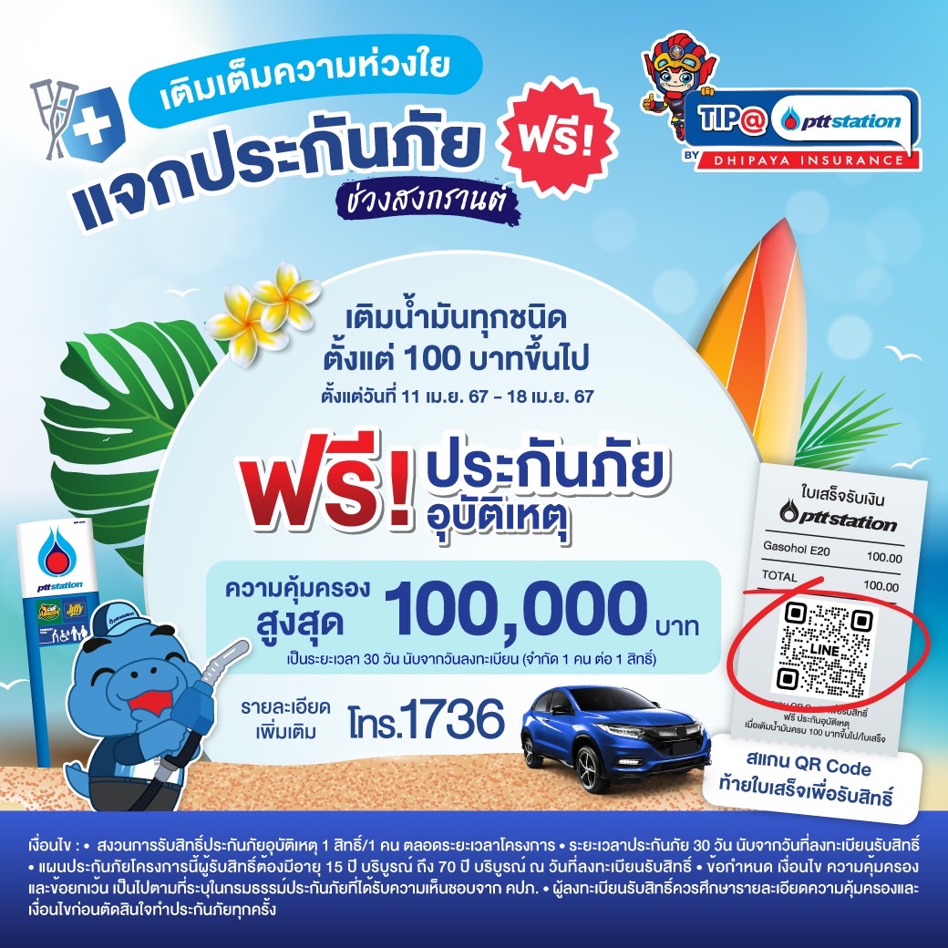 สามารถ Scan QR Code ท้ายใบเสร็จ เพื่อลงทะเบียนรับสิทธิประกันภัยอุบัติเหตุ “สงกรานต์คลายร้อน” ฟรี ระหว่างวันที่ 11 เมษายน 2567 – 18 เมษายน 2567