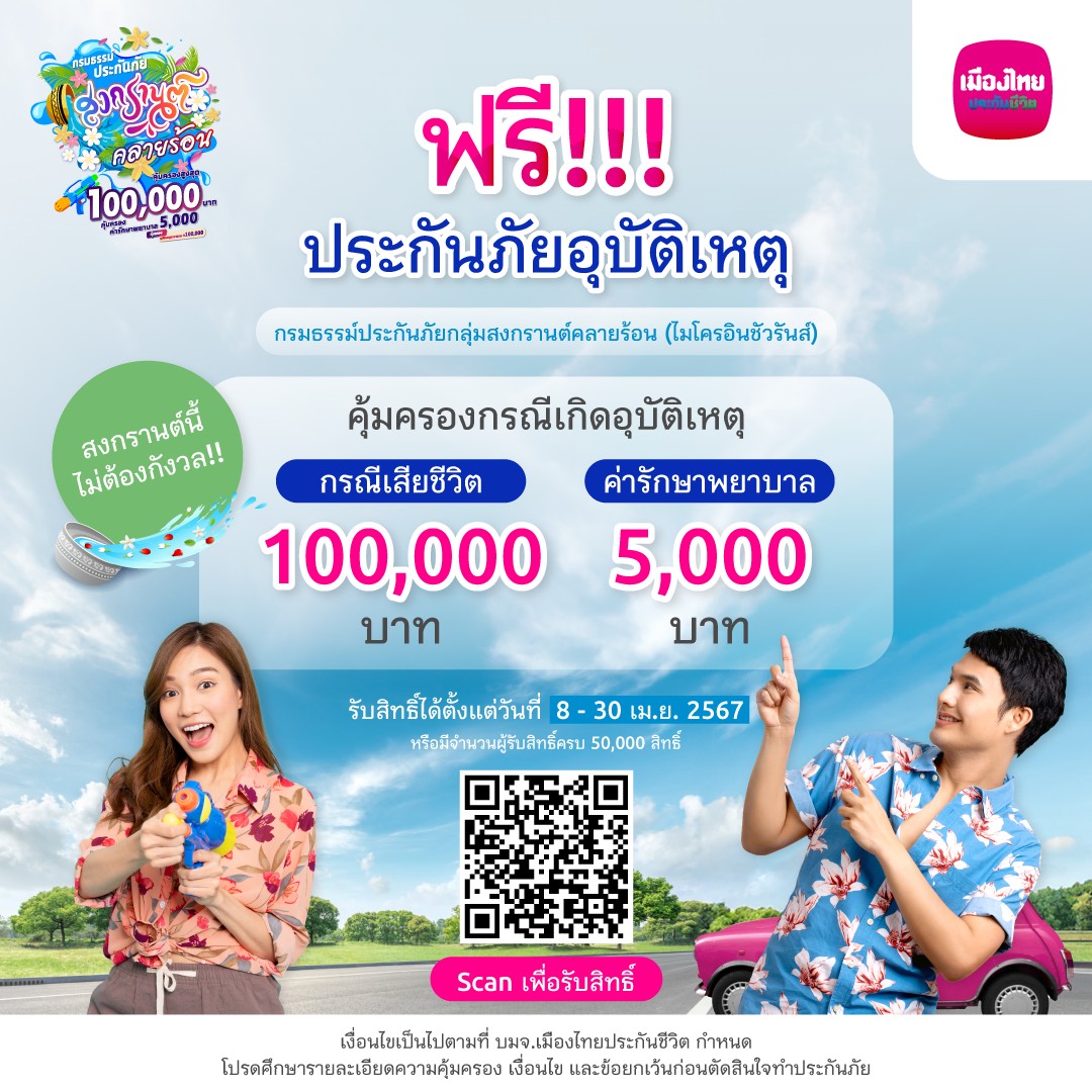 เมืองไทยประกันชีวิต จึงขอมอบความอุ่นใจที่มากขึ้นในช่วงเทศกาลสงกรานต์ ซึ่งเป็นเทศกาลแห่งความสุขของทุกคน ด้วยการมอบความคุ้มครอง “กรมธรรม์ประกันภัยกลุ่มสงกรานต์คลายร้อน (ไมโครอินชัวรันส์)ฟรี ซึ่งเป็นประกันภัยอุบัติเหตุกลุ่มที่ให้ความคุ้มครองครอบคลุมทั้งด้านชีวิตและค่ารักษาพยาบาลเนื่องจากอุบัติเหตุ ให้กับประชาชาชนทั่วไป  โดยสามารถกดรับสิทธิ์และลงทะเบียนผ่าน Link  หรือ QR Code บนช่องทาง Social Media ของบริษัทฯ ประกอบด้วย ช่องทาง Facebook,  Instagram,  Line Official Account  ของ  Muang Thai Life  โดยสามารถรับสิทธิ์ได้ตั้งแต่วันที่ 8 – 30  เมษายน 2567 หรือ มีผู้รับสิทธิ์ครบจำนวน 50,000 สิทธิ์  โดยผู้ที่ลงทะเบียนสำเร็จจะได้รับ SMS ยืนยันความคุ้มครอง