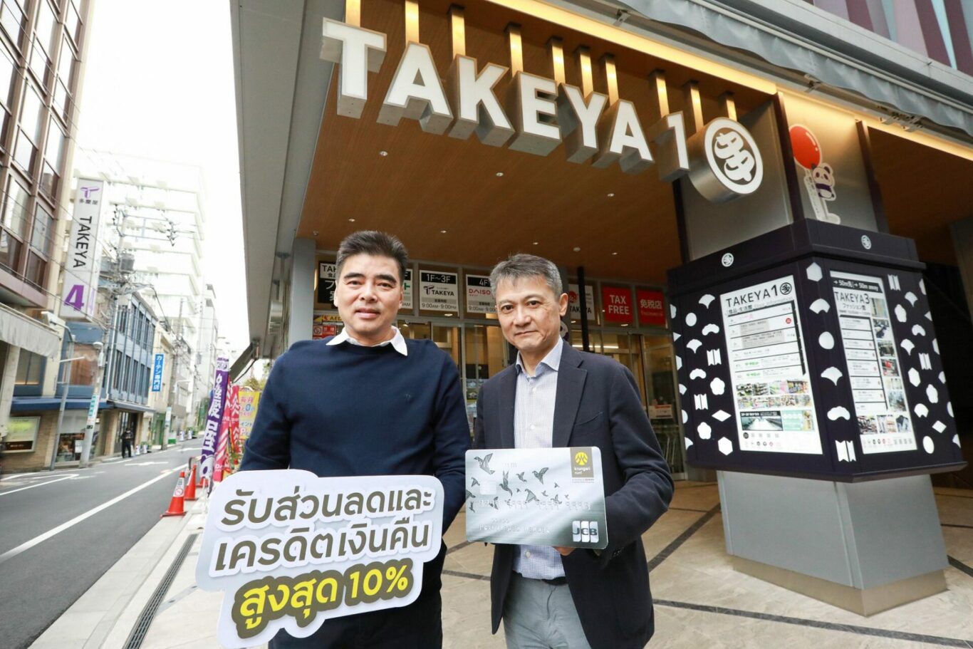 กรุงเทพฯ, 10 เมษายน 2567 – บัตรเครดิต กรุงศรี นำโดย นายสมหวัง โตรักตระกูล (ซ้าย) กรรมการผู้จัดการ บริษัท บัตรกรุงศรีอยุธยา จำกัด ร่วมกับ เจซีบี นำโดย มร.โย อิมานิชิ ผู้อำนวยการอาวุโส (ขวา) ฝ่ายวางแผนธุรกิจระดับโลก บริษัท เจซีบี อินเตอร์เนชันแนล จำกัด ชวนเที่ยวสนุก ช้อปคุ้มที่ญี่ปุ่น มอบสิทธิพิเศษสำหรับสมาชิกบัตรเครดิต กรุงศรี เจซีบี แพลทินัม และบัตรเครดิตสยาม ทาคาชิมายะ เจซีบี รับเครดิตเงินคืนสูงสุด 10% จากยอดใช้จ่ายสะสมผ่านบัตรด้วยสกุลเงินเยนตามเงื่อนไขที่ร้านค้าในญี่ปุ่นที่ร่วมรายการ (เครดิตเงินคืนสูงสุด 5,000 เยน ต่อหมายเลขบัตรเครดิต ตลอดรายการ) พิเศษ! รับส่วนลด 10% ที่ห้างทาเคยะเมื่อใช้จ่ายผ่านบัตร 5,000 เยนขึ้นไปต่อเซลล์สลิป (รับส่วนลดสูงสุด 10,000 เยน) ตั้งแต่ 1 กุมภาพันธ์ 2567 – 30 เมษายน 2567 (เงื่อนไขเป็นไปตามที่กำหนด) ข้อมูลเพิ่มเติม www.krungsricard.com/th/promotion/takeya
