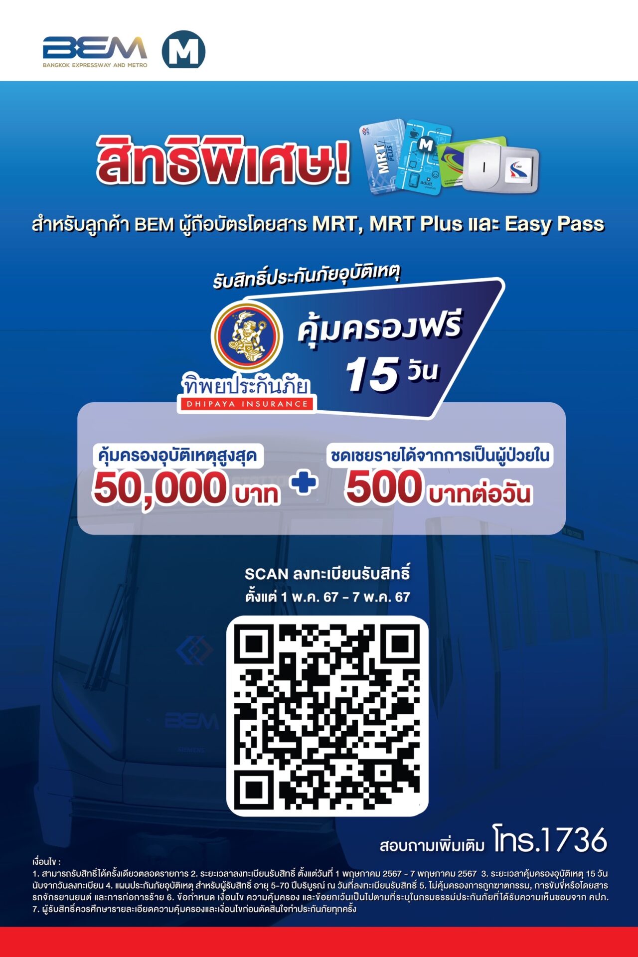 สามารถลงทะเบียนรับสิทธิ์ความคุ้มครองดังกล่าว เพียงสแกน QR Code ได้ที่สื่อประชาสัมพันธ์ของสถานีรถไฟฟ้า MRT, ด่านทางด่วน และช่องทางออนไลน์ ตั้งแต่วันที่ 1 – 7 พฤษภาคม 2567 สอบถามรายละเอียดเพิ่มเติม โทร. 1736