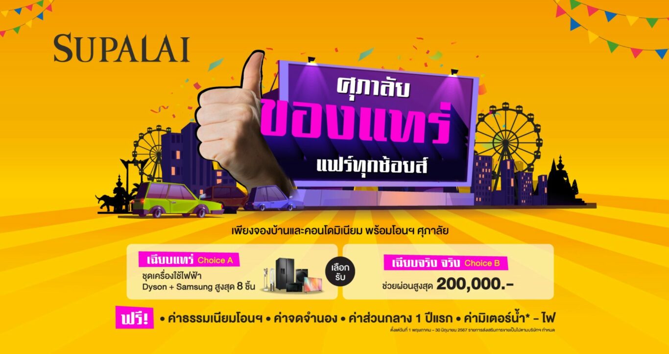 ให้คุณได้เป็นเจ้าของโครงการบ้าน และคอนโดมิเนียมพร้อมอยู่ในทำเลโดนใจกับโปรฯเด็ด “ศุภาลัย ของแทร่ แฟร์ทุกช้อยส์” ที่จัดหนักให้ ฟรี! ค่าธรรมเนียมโอนกรรมสิทธิ์, ค่าจดจำนอง, ค่าส่วนกลาง 1 ปีแรก และค่ามิเตอร์น้ำ* – ไฟ พร้อมของแถมสุดเฉียบกับช้อยส์แรก รับไปเลยชุดเครื่องใช้ไฟฟ้า Dyson + Samsung สูงสุด 8 ชิ้น* หรือช้อยส์ที่ 2 ช่วยผ่อนสูงสุด* 200,000 บาท ก็เฉียบไม่แพ้กัน (*เงื่อนไขเป็นไปตามที่บริษัทฯ กำหนด) ตั้งแต่วันที่ 1 พฤษภาคม – 30 มิถุนายนนี้