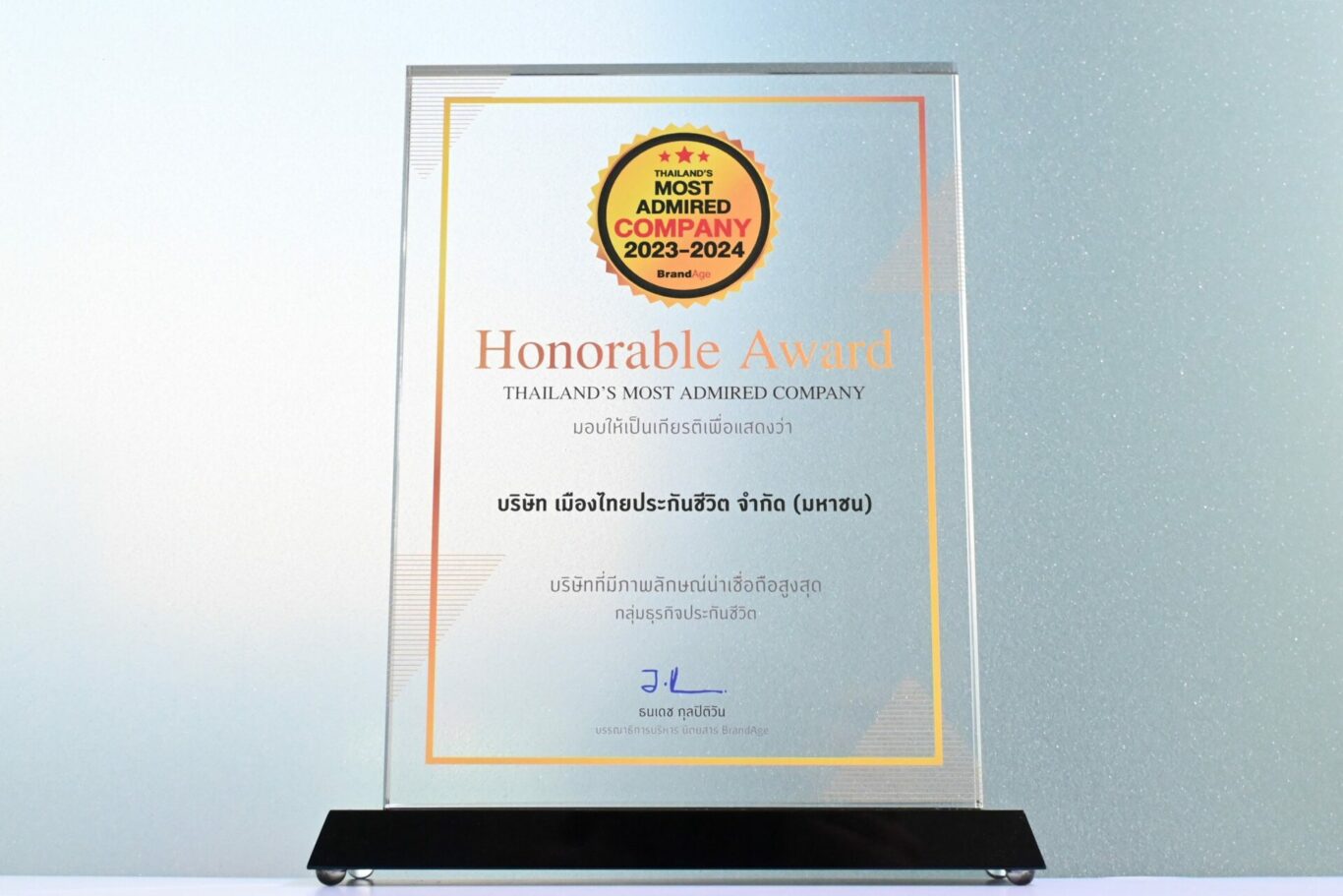 บริษัท เมืองไทยประกันชีวิต จำกัด (มหาชน) ตอกย้ำบริษัทประกันแห่งปี คว้ารางวัล 2023-2024 Thailand’s Most Admired Company จาก BrandAge ร่วมกับคณะเทคโนโลยีสื่อสารมวลชน มหาวิทยาลัยเทคโนโลยีราชมงคลพระนคร ในการดำเนินการเก็บแบบสอบถามและประเมินผล เพื่อศึกษาเรื่องความน่าเชื่อถือขององค์กร ในเรื่องของการมีภาพลักษณ์ที่ดีในงานวิจัย โดยมีการจัดอันดับบริษัทต่างๆ โดยใช้หลักการการชี้วัดความชื่นชอบของผู้บริโภคที่มีต่อบริษัทที่มีความโดดเด่นในด้านความสามารถในการสร้างสรรค์นวัตกรรม (Innovation) ความสามารถในการดำเนินธุรกิจ (Business Performance) ภาพลักษณ์ (Corporate Image) การบริหารการจัดการ (Management) ความรับผิดชอบต่อสังคม (Sustainable Development) และการบริการ (Excellence Service)