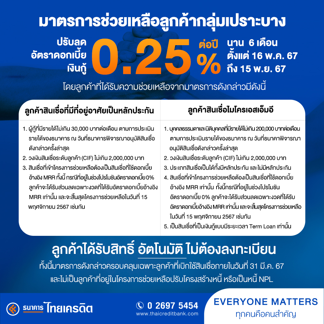 สำหรับผู้ที่สนใจสามารถดูรายละเอียดเพิ่มเติมได้ที่เว็บไซต์ https://www.thaicreditbank.com/th/มาตรการช่วยเหลือลูกค้ากลุ่มเปราะบาง หรือสอบถามรายละเอียดเพิ่มเติมได้ที่ Call Center ธนาคารไทยเครดิต โทร. 0 2697 5454