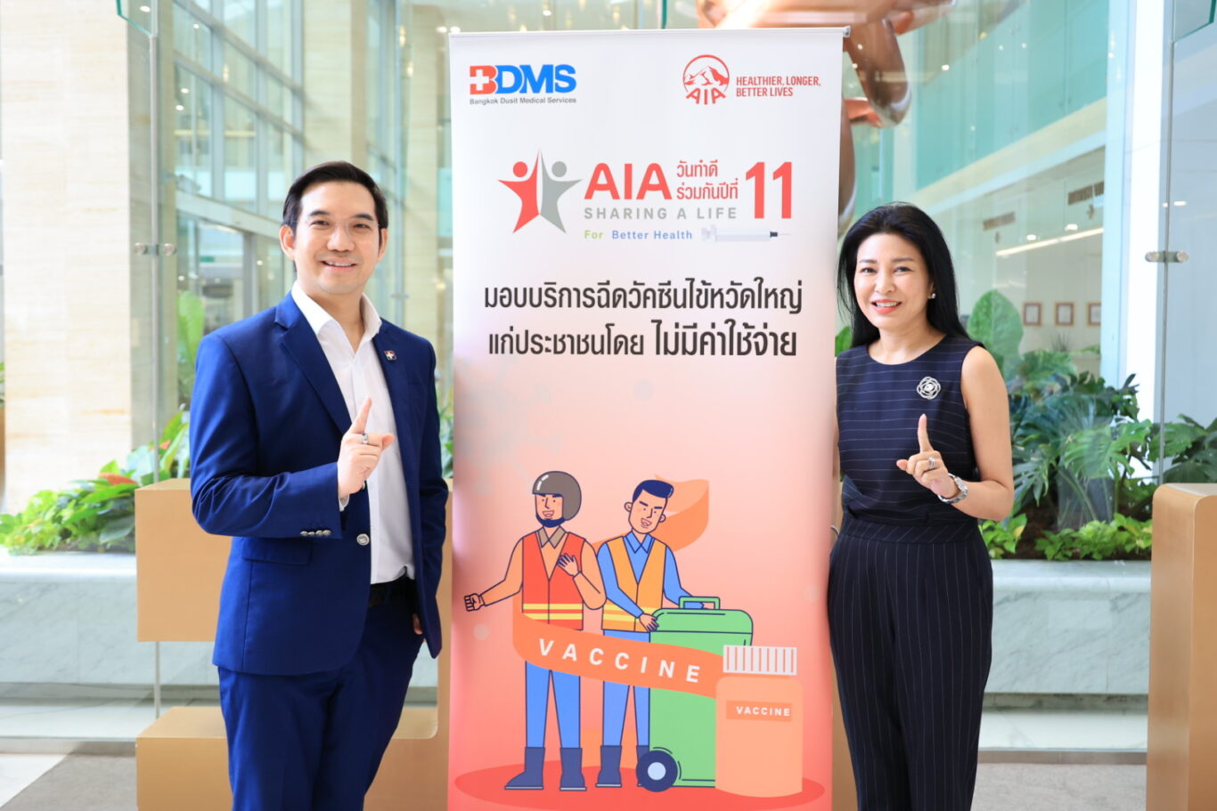 กรุงเทพฯ 20 พฤษภาคม 2567 – เอไอเอ ประเทศไทย ร่วมมือกับ โรงพยาบาลในเครือ BDMS มอบบริการฉีดวัคซีนไข้หวัดใหญ่แก่ประชาชน โดยไม่มีค่าใช้จ่าย ภายใต้โครงการ AIA Sharing A Life ครั้งที่ 11 นำโดย นายแพทย์ประมุกข์ ทรงจักรแก้ว (กลาง) ที่ปรึกษาอาวุโสฝ่ายปฏิบัติการ นางสาวรพีพร วงศ์ทองคำ (ที่ 3 จากขวา) ผู้อำนวยการฝ่ายสื่อสารองค์กรและภาพลักษณ์ และ นายแพทย์สมสกุล ศรีพิสุทธิ์ (ที่ 2 จากขวา) ผู้อำนวยการฝ่ายบริหารจัดการด้านสุขภาพ ร่วมด้วยคณะแพทย์ผู้บริหารโรงพยาบาลกรุงเทพ ประกอบด้วย นายแพทย์มนต์สรร อัศวนพเกียรติ (ที่ 3 จากซ้าย) ผู้อำนวยการฝ่ายผลิตภัณฑ์และโครงสร้างราคา BDMS นายแพทย์อัศวิน ภูวธนสาร (ที่ 2 จากซ้าย) รองผู้อำนวยการโรงพยาบาลกรุงเทพ และ แพทย์หญิงกิตนันท์ พิชัยณรงค์ (ขวาสุด) อายุรแพทย์ โรงพยาบาลกรุงเทพ ซึ่งโครงการ AIA Sharing A Life ครั้งที่ 11 จะจัดขึ้นทั้งสิ้น 10 แห่ง ได้แก่