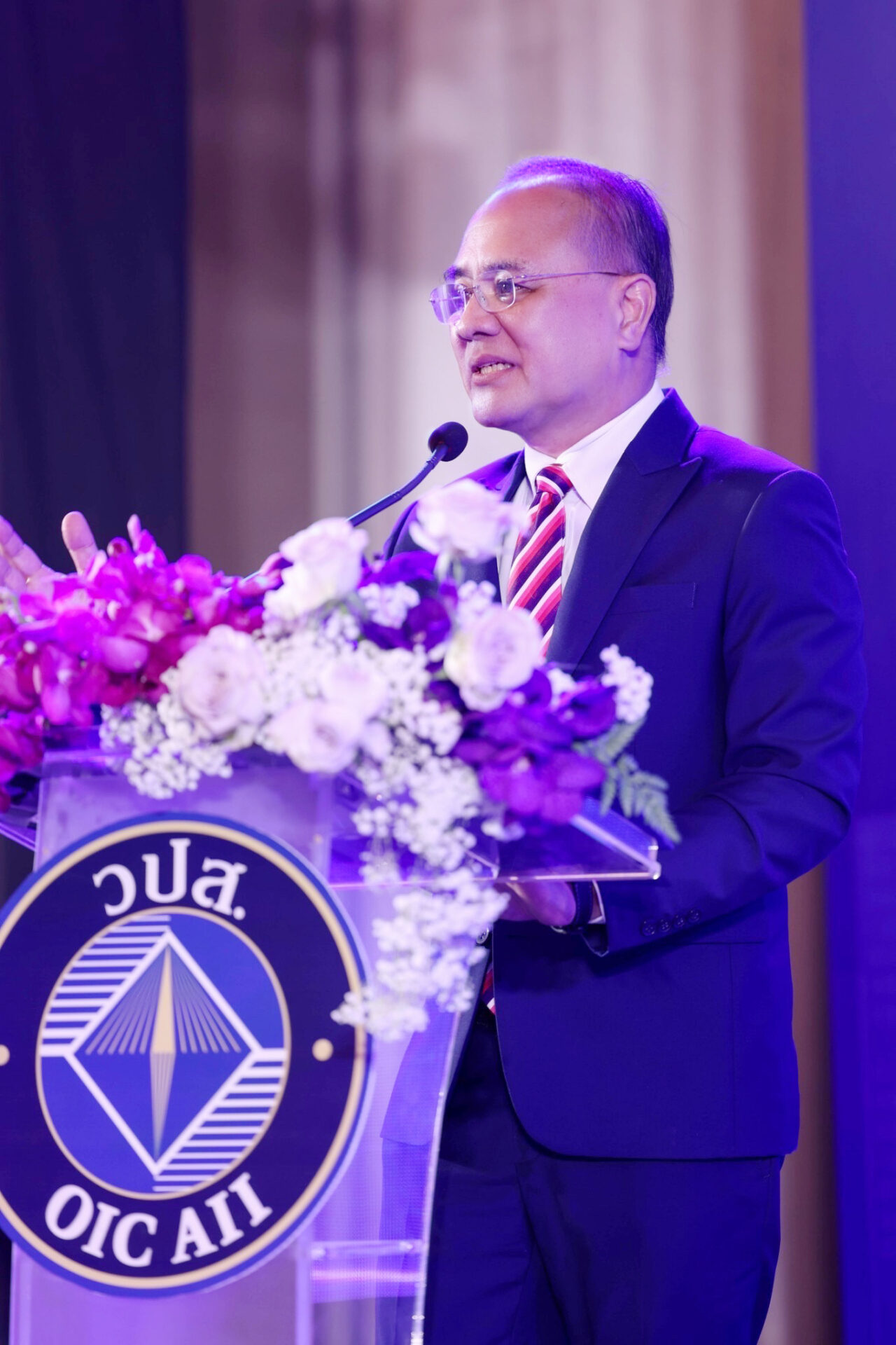 ในโอกาสนี้ นายลวรณ แสงสนิท ปลัดกระทรวงการคลัง ได้กล่าวปาฐกถาพิเศษในหัวข้อ “บทบาทการประกันภัยกับการส่งเสริมและสร้างความแข็งแกร่งให้กับระบบเศรษฐกิจและสังคมของประเทศอย่างยั่งยืน” โดยมีใจความสำคัญตอนหนึ่งว่า การปรับตัวและการเรียนรู้จากประสบการณ์ในอดีตเป็นสิ่งสำคัญในการทำให้องค์กรเติบโตและประสบความสำเร็จในสภาวะที่เปลี่ยนแปลงอย่างรวดเร็วและต่อเนื่อง โดยเฉพาะหน่วยงานกำกับและส่งเสริมการประกอบธุรกิจประกันภัย ต้องเผชิญกับความท้าทายหลัก 5 ประการ คือ ประการแรก การเติบโตและความผันผวนของเศรษฐกิจ เช่น การเปลี่ยนแปลงของอัตราดอกเบี้ย การเติบโตของ GDP การขยายตัวของการประกันภัยรถไฟฟ้า (EV) ประการที่ 2 สังคมผู้สูงอายุและชีวิตหลังเกษียณ ซึ่งประเทศไทยเข้าสู่สังคมผู้สูงวัยระดับสุดยอด (Super-Aged Society) ในปี 2575 ถือเป็นโอกาสของภาคธุรกิจประกันภัยที่จะออกแบบผลิตภัณฑ์ประเภทต่าง ๆ เช่น ประกันภัยสุขภาพ ประกันชีวิตแบบบำนาญ เพื่อรองรับความต้องการของตลาดผู้สูงอายุ ประการที่ 3 ความก้าวหน้าทางเทคโนโลยีและการเข้าถึงลูกค้า โดยสามารถตอบโจทย์ความต้องการที่เฉพาะเจาะจงของลูกค้าได้มากขึ้น ดูแลลูกค้าได้อย่างเหมาะสม และเป็นไปตามหลักเกณฑ์ที่กำหนด ประการที่ 4 การนำหลักการการพัฒนาอย่างยั่งยืน (ESG) ไปใช้ในกระบวนการต่าง ๆ ของบริษัทประกันภัย และ ประการที่ 5 การปรับปรุงกฎหมายต่าง ๆ ที่เกี่ยวข้องเพื่อให้สอดรับกับมาตรฐานสากล และบริบทที่เปลี่ยนแปลงไป