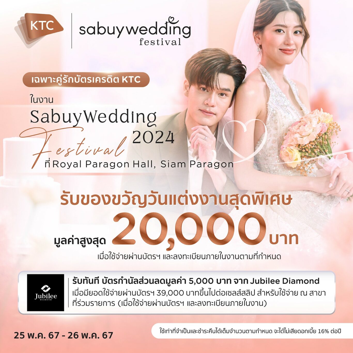 สำหรับการจัดงาน SabuyWedding Festival 2024  มีกำหนดจัดขึ้นระหว่างวันที่ 25 พฤษภาคม 2567 – วันที่ 26 พฤษภาคม 2567 ที่ รอยัล พารากอน ฮอลล์ ศูนย์การค้าสยามพารากอน สามารถดูรายละเอียดเพิ่มเติมได้ที่ https://www.ktc.co.th/promotion/hotel-resort/wedding-package  ทั้งนี้คาดว่าจะมียอดรวมการใช้จ่ายผ่านบัตรเครดิตเคทีซีภายในงานดังกล่าวไม่ต่ำกว่า 10 ล้านบาท