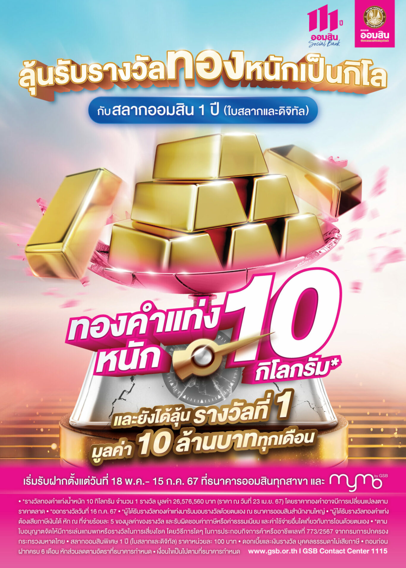 สลากออมสินพีคสุด ลุยแจกต่อเพิ่มทองคำแท่งหนัก 10 กิโลกรัม เปิดรับฝากตั้งแต่วันนี้ – 15 ก.ค. 67 จับรางวัลผู้โชคดี 16 ก.ค. 67