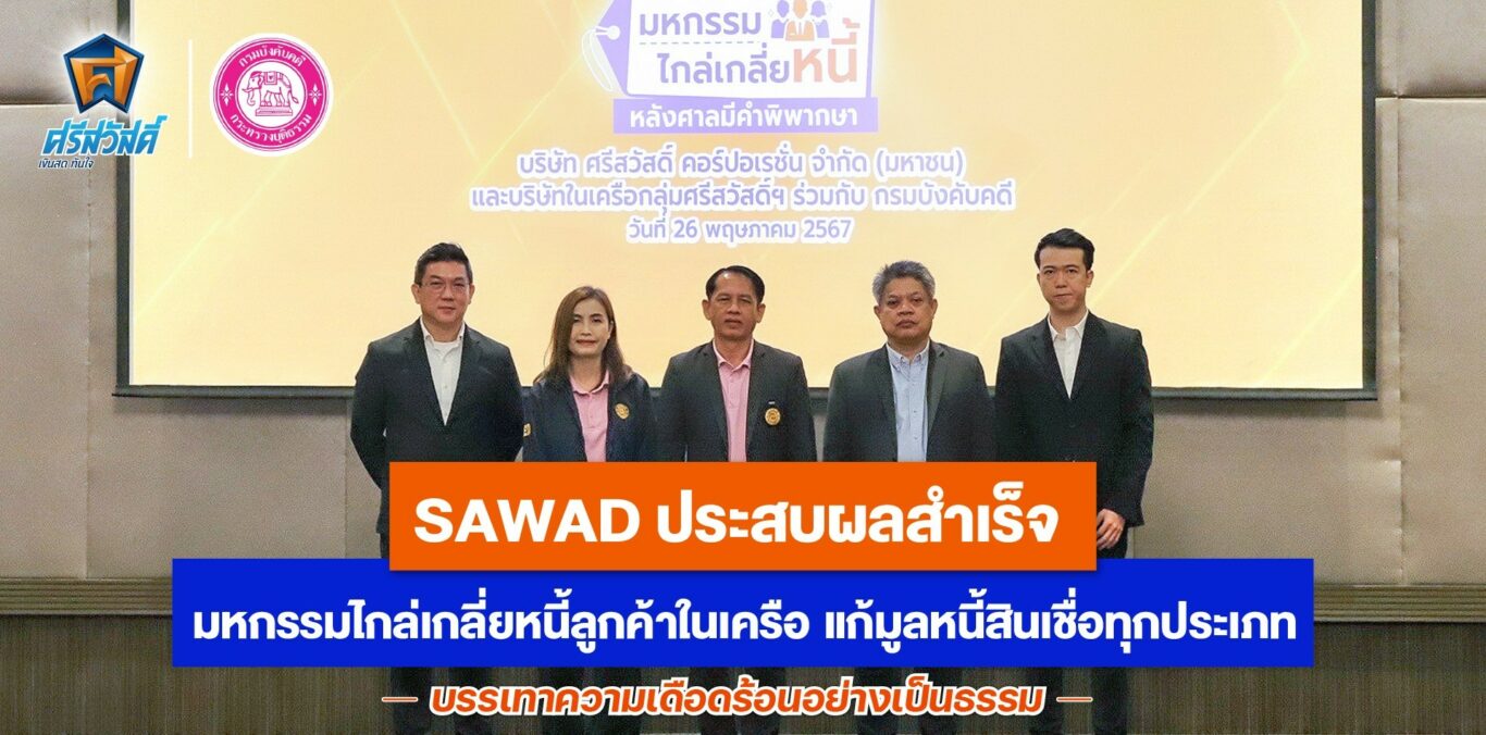 SAWAD เผยความสำเร็จในงาน ‘มหกรรมไกล่เกลี่ยหนี้หลังศาลมีคำพิพากษา’ ที่ร่วมมือกับกรมบังคับคดี สามารถหาทางออกร่วมกันแก้ปัญหาลูกหนี้ได้สำเร็จ ตอกย้ำแนวทางในการช่วยเหลือลูกค้าในเครืออย่างเป็นธรรม พร้อมให้คำปรึกษาเพื่อแก้ปัญหาหนี้เรื้อรัง