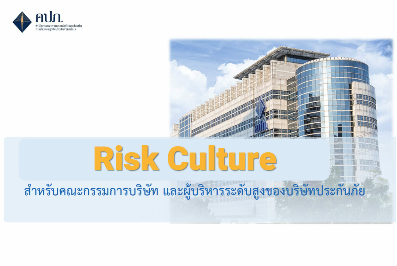 สำนักงานคณะกรรมการกำกับและส่งเสริมการประกอบธุรกิจประกันภัย (สำนักงาน คปภ.) จัดสัมมนาหัวข้อ “Risk Culture สำหรับกรรมการและผู้บริหารระดับสูงของธุรกิจประกันภัย” ผ่านระบบออนไลน์ โดยมีวัตถุประสงค์เพื่อส่งเสริมและสนับสนุนให้บริษัทประกันภัยมองเห็นถึงความสำคัญของการมีวัฒนธรรมความเสี่ยง (Risk Culture) ภายในองค์กรที่เข้มแข็ง เป็นส่วนหนึ่งของวัฒนธรรมองค์กรที่เป็นพื้นฐานสำคัญในการดำเนินธุรกิจ เพื่อช่วยสร้างเกราะคุ้มกันที่ดีให้กับธุรกิจประกันภัยสามารถเท่าทันหรือปรับตัวได้เร็วกับความเสี่ยงและสภาพแวดล้อมในการดำเนินธุรกิจที่เปลี่ยนแปลงไป รวมทั้งความเสี่ยงในรูปแบบใหม่ที่จะเกิดขึ้นในอนาคตเพื่อให้บริษัทประกันภัยทั้งขนาดใหญ่ กลาง และเล็ก สามารถรับมือกับความผันผวนที่เกิดขึ้นในสถานการณ์ปัจจุบันและอนาคต