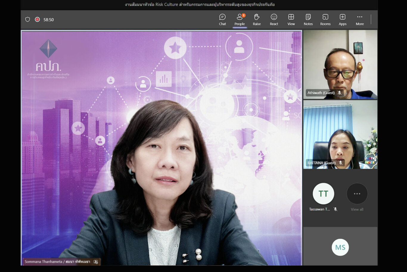 ต่อจากนั้นเป็นการบรรยายในหัวข้อ “Risk Culture: Theory into practice” โดยสำนักงาน คปภ. ได้รับเกียรติจาก นายพันธ์ศักดิ์ เสตเสถียร หุ้นส่วนสายงานที่ปรึกษาด้านความเสี่ยง บริษัท PWC ประเทศไทย จำกัด ซึ่งมาฉายภาพให้กรรมการและผู้บริหารระดับสูงของธุรกิจประกันภัยเกี่ยวกับการนำ Concept เรื่อง Risk Culture ไป Implementation ในองค์กรให้สามารถเกิดขึ้นจริงได้อย่างไร และมีประสิทธิภาพสูงสุด รวมทั้งจากการเข้าไปช่วยในหลายองค์กร Setup เรื่อง Risk Culture และการทำ Enterprise Risk Management ที่สามารถชี้ให้เห็นถึงความคิดมุมมองของกรรมการในหลากหลายองค์กร รวมถึงประเด็นที่เป็น Pain Point สำคัญในการขับเคลื่อนและสร้าง Risk Culture การบูรณาการเข้าเป็นส่วนหนึ่งของกลยุทธ์ในการดำเนินธุรกิจ