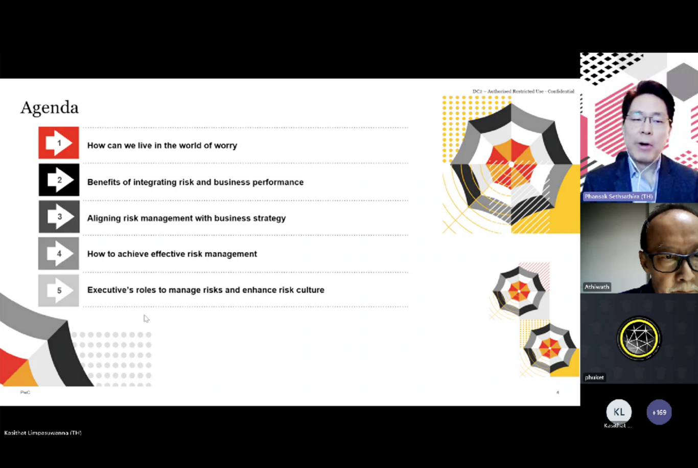 นอกจากนี้ ได้กล่าวถึงผลการทำ Survey ต่าง ๆ ที่ทาง PWC ได้จัดทำขึ้น เช่น Trend and Risk Landscape และ Key Challenges ในเรื่อง Risk Culture จากมุมมองของกรรมการบริษัทใน Asia Pacific เพื่อเป็นข้อมูล Mapping สนับสนุนเพิ่มเติมประกอบการบรรยาย โดยในช่วงท้ายได้กล่าวถึงการทำ Core Competencies of Culture Management และ How to Achieve Effective Risk Management ซึ่งเป็นส่วนสำคัญในการสร้าง Risk Culture ภายในองค์กร อย่างไรก็ตาม การสร้างวัฒนธรรมความเสี่ยงที่สามารถรวมเข้าเป็นส่วนหนึ่งกับวัฒนธรรมองค์กร ต้องได้รับการผลักดันและส่งเสริมอย่างเป็นรูปธรรม