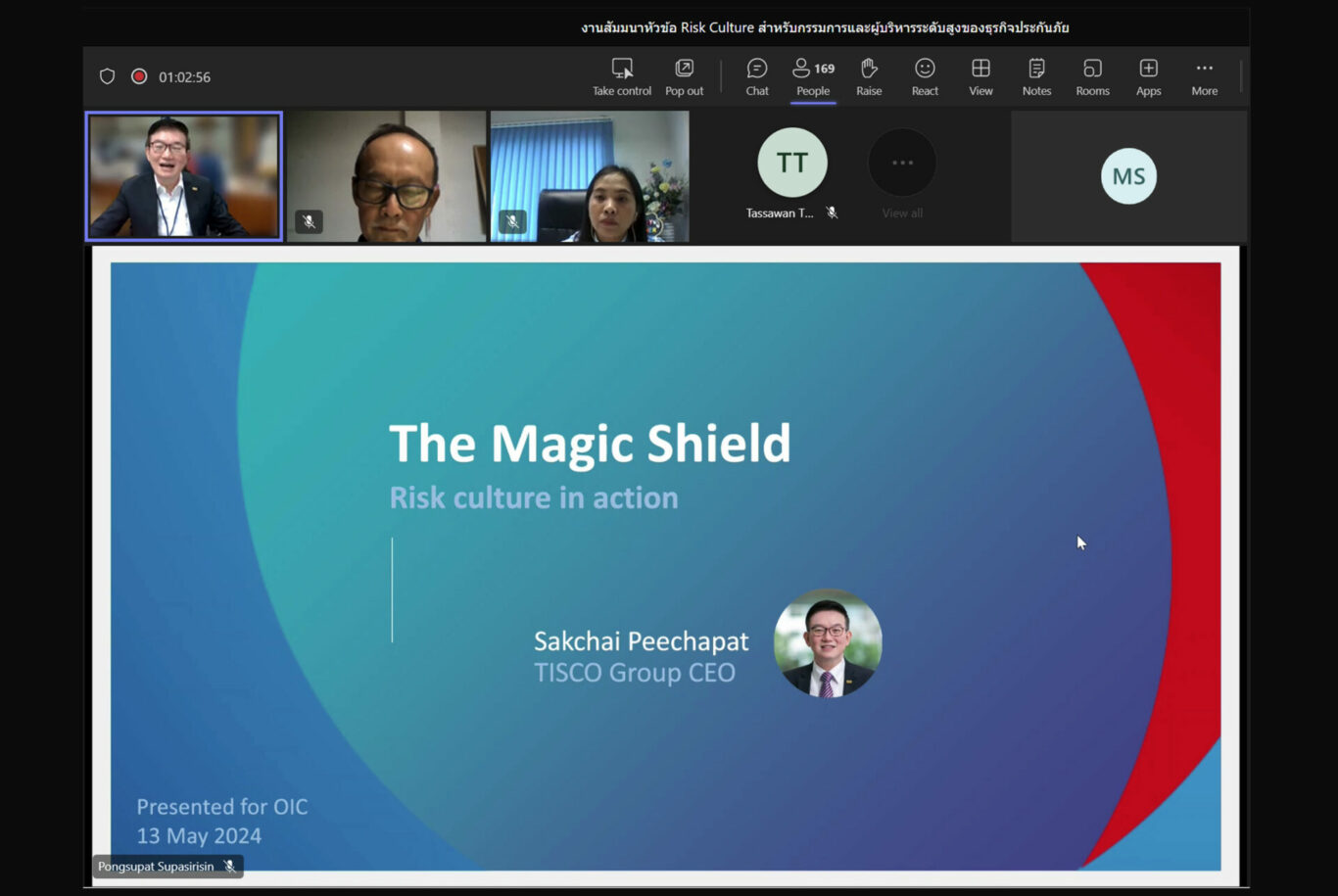 โดยในการบรรยายได้รับเกียรติจาก นายศักดิ์ชัย พีชะพัฒน์ ประธานเจ้าหน้าที่บริหารกลุ่มทิสโก้ (TISCO Financial Group PLC.) มาถ่ายทอดประสบการณ์จริงในการกำกับดูแลธุรกิจ และการสร้าง Risk Culture ในองค์กร รวมทั้งแบ่งปันประสบการณ์ช่วงที่ประเทศไทยเกิด Pandemic เพื่อถ่ายทอดแนวคิดมุมมองของกลุ่มทิสโก้ที่สามารถรับมือผลกระทบจากสถานการณ์โควิดได้แบบ Robust และ Resilience นอกจากนี้ ได้แบ่งปันมุมมองขององค์ประกอบที่สำคัญในการสร้าง TISCO Culture ได้แก่ 1. Risk Management and Corporate Governance 2. Customer Centric และ 3. Innovation and Productivity ซึ่งองค์กรใดมี Risk Culture ที่ดีก็เสมือนมีโล่เป็นเกราะป้องกัน (The Magic Shield) จะเป็นส่วนที่ช่วยให้องค์กรสามารถรอดพ้นจากสภาวะวิกฤตต่าง ๆ ได้อย่างมีประสิทธิภาพ