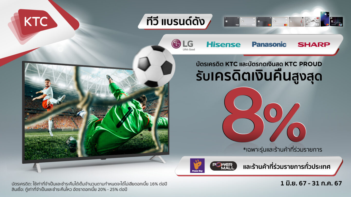เคทีซีร่วมยกระดับประสบการณ์สมาชิกบัตรเครดิตและบัตรกดเงินสด “เคทีซี พราว” ชมการถ่ายทอดกีฬาระดับโลกทุกแมตช์ด้วยความคมชัดสมจริง ทั้งฟุตบอล EURO 2024 และโอลิมปิก 2024 จับมือแบรนด์ LG, HISENSE, PANASONIC และ SHARP จัดโปรโมชันพิเศษ สมาร์ททีวี ผ่อนชำระ 0% สูงสุด 10 เดือน และรับเครดิตเงินคืนสูงสุดถึง 8% ณ ร้านค้าตัวแทนจำหน่ายของแบรนด์ที่ร่วมรายการ ระหว่างวันที่ 1 มิถุนายน 2567 ถึง 31 กรกฎาคม 2567