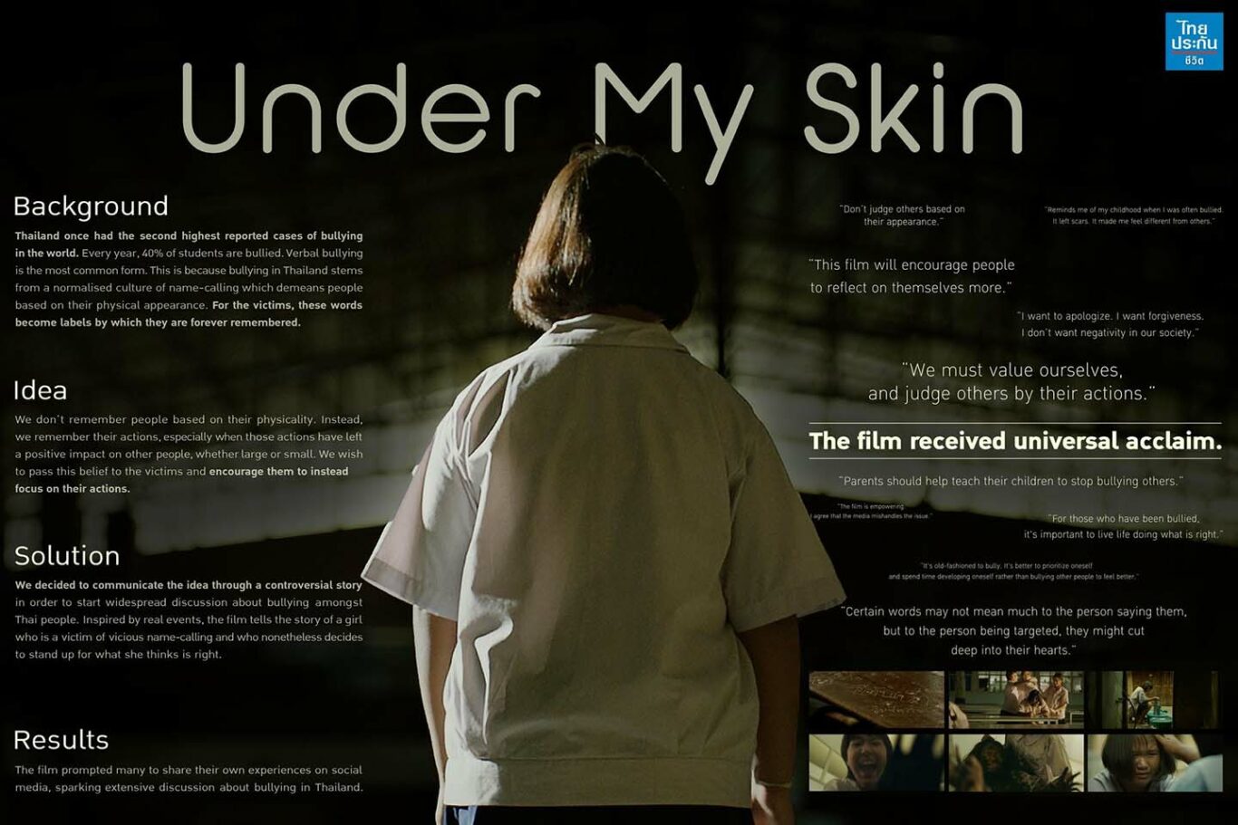 ภาพยนตร์โฆษณาชุด “ผิวของแม่: Under My Skin” จึงเป็นโฆษณาที่บอกเล่าเรื่องราวของ “การทำชีวิตให้มีคุณค่าต่อผู้อื่น” ได้รับการสร้างสรรค์โดยเอเจนซี่ โอกิลวี่ ประเทศไทย เป็นภาพยนตร์โฆษณาที่จัดทำขึ้นเป็นพิเศษ เปิดแสดงครั้งแรกในโครงการไทยประกันชีวิต Experience ณ อาคารไทยประกันชีวิต สาขาบางนา
