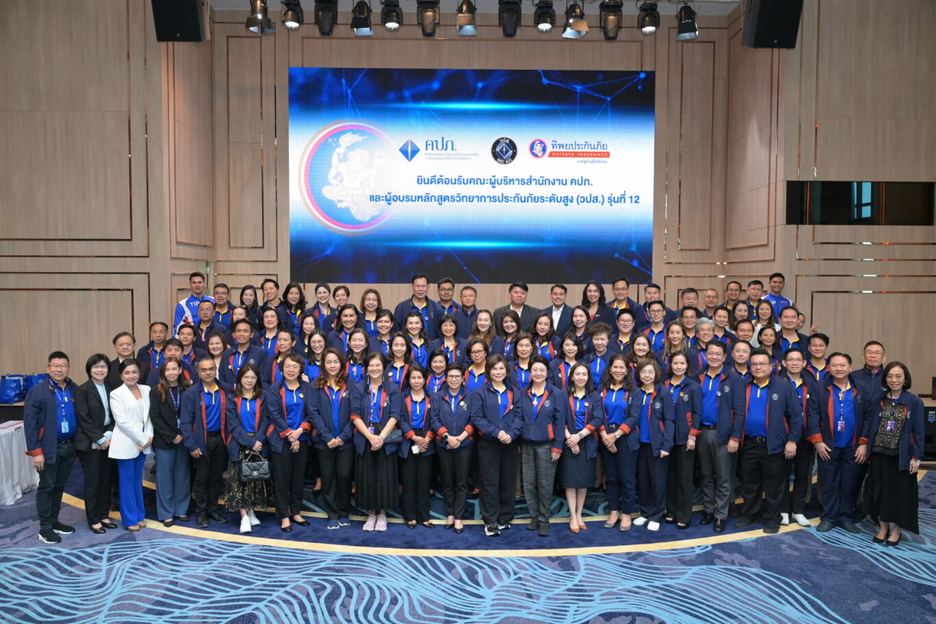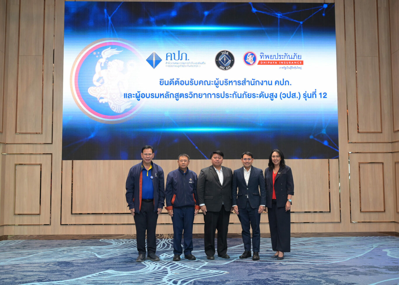 นายอนุกูล เย็นใจ รองกรรมการผู้จัดการใหญ่ ด้านรับประกันภัยและสินไหมทดแทน บริษัท ทิพยประกันภัย จำกัด (มหาชน) พร้อมผู้บริหารให้การต้อนรับ นายนิรัตน์ ทรัพย์ทวีธรรม ผู้อำนวยการฝ่ายอาวุโส ฝ่ายสถาบันวิทยาการประกันภัยระดับสูงและผู้อำนวยการหลักสูตร วปส. รุ่นที่ 12 นายแพทย์สุขุม กาญจนพิมาย ตัวแทนผู้บริหาร วปส. รุ่นที่ 12 พร้อมคณะผู้บริหารผู้ทรงคุณวุฒิอบรมหลักสูตรวิทยาการประกันภัยระดับสูง (วปส.) รุ่นที่ 12