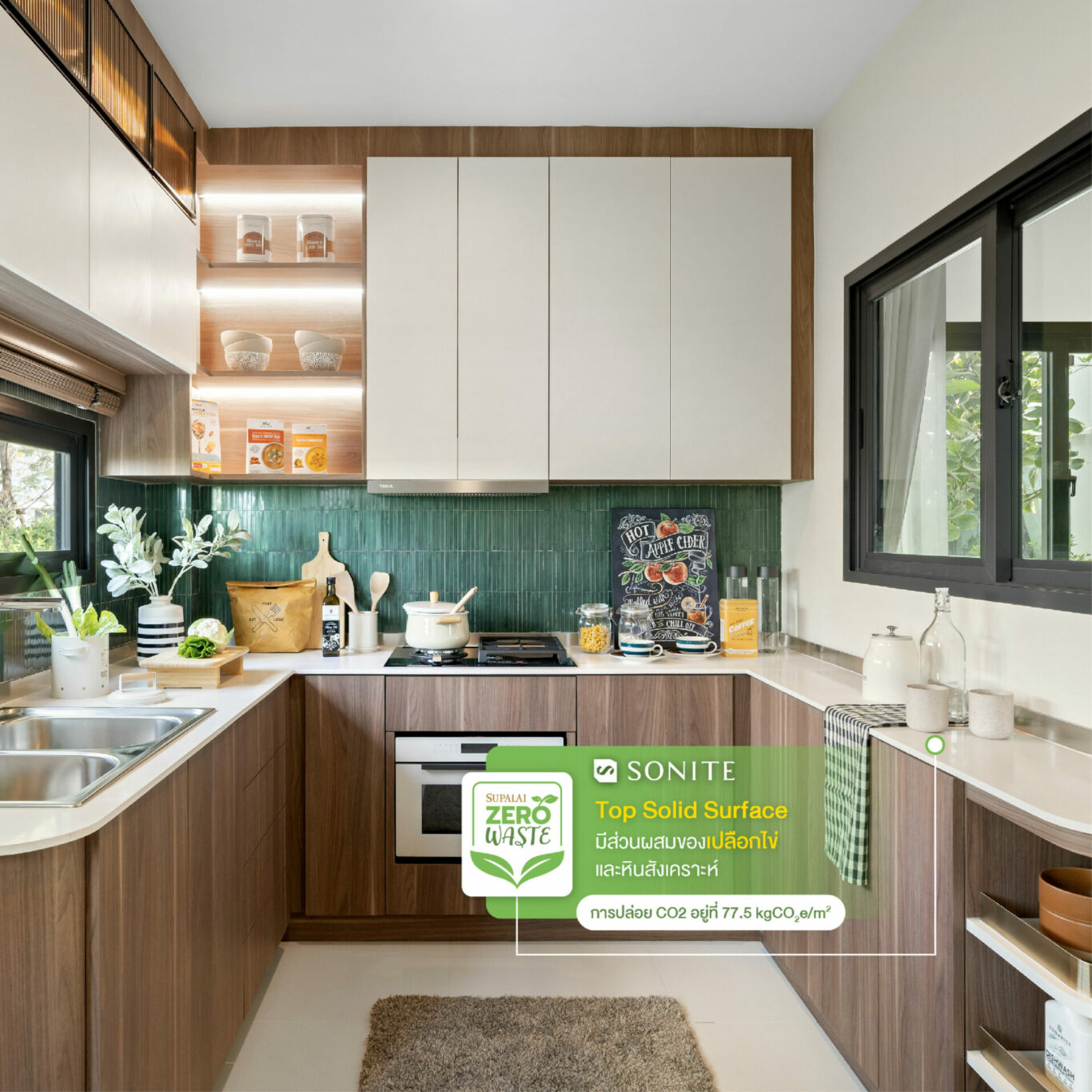 นางสาวอโนมา ไทยกล้า Operating Manager บริษัท โซไนต์ อินโนเวทีฟ เซอร์เฟสเซส จำกัด เปิดเผยว่า ด้วยความมุ่งมั่นในการเป็นมิตรต่อสิ่งแวดล้อม SONITE ไม่เคยหยุดพัฒนาเพื่อสร้างสรรค์นวัตกรรมและการออกแบบใหม่ๆ บริษัทฯ ได้แปรรูปผลิตภัณฑ์จากวัสดุเหลือใช้ อาทิ เช่น เปลือกข้าว เปลือกไข่ ใยมะพร้าว พลาสติกที่ย่อยสลายได้ยาก ให้กลายเป็นผลิตภัณฑ์ที่มีดีไซน์ทันสมัยและใช้งานได้จริง ด้วยกระบวนการผลิตที่มีความรับผิดชอบต่อสิ่งแวดล้อมเพื่อลดปริมาณการปล่อยก๊าซเรือนกระจก สำหรับผลิตภัณฑ์ใหม่ล่าสุดของบริษัทฯ “E-Marble” หรือ หินอ่อน เป็นผลผลิตจากการผสมผสานระหว่าง “เปลือกไข่” และหินสังเคราะห์ ทำให้วัสดุมีความแข็งแรงทนทาน ดีไซน์เรียบง่าย มีความหรูหรา และทันสมัย โดยหินอ่อนพื้นที่ 1 ตารางเมตร มีค่าการปล่อยก๊าซคาร์บอนไดออกไซด์ ต่ำที่ 77.5 กิโลกรัมคาร์บอนไดออกไซต์เทียบเท่า ซึ่งทางศุภาลัยได้เลือกใช้ผลิตภัณฑ์ TOP SOLID SURFACE นำมาตกแต่งเคานเตอร์ครัวบ้านตัวอย่าง ทำให้พื้นผิวเรียบสนิท ทำความสะอาดง่าย ยับยั้งการเจริญเติบโตของแบคทีเรีย และปลอดภัยต่อลูกค้า