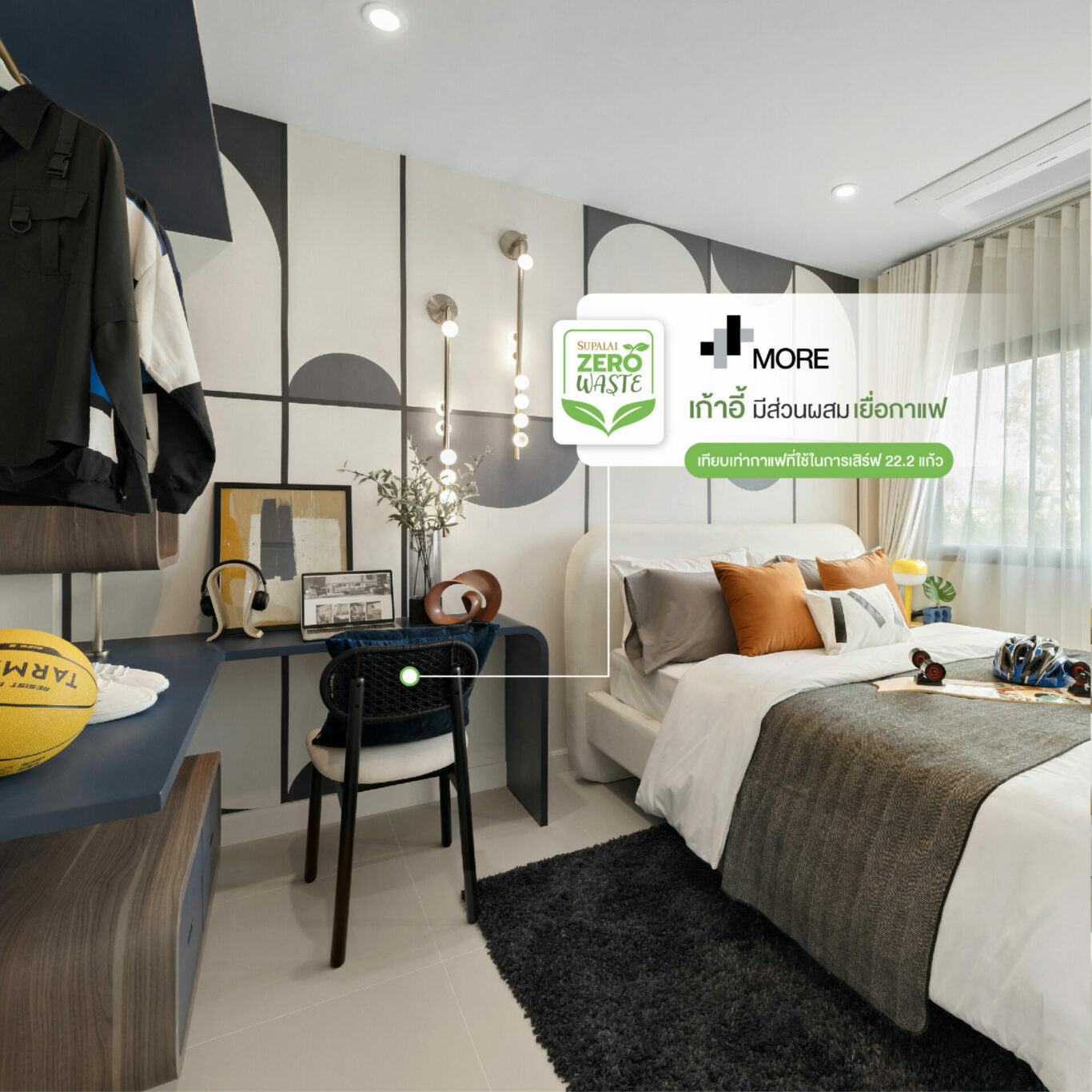 การร่วมมือกับศุภาลัยในครั้งนี้ไม่ได้เป็นเพียงแค่การเลือกใช้ผลิตภัณฑ์เฟอร์นิเจอร์จากแบรนด์ MORE เท่านั้น แต่ยังเป็นการกระตุ้นให้วัสดุที่ไม่ใช้แล้ว กลับเข้าสู่กระบวนการ Upcycling เพื่อสร้างผลิตภัณฑ์จากวัสดุทางเลือกในชีวิตประจำวันที่ทุกคนสามารถเข้าถึงได้ ผลิตภัณฑ์ตัวอย่างในโครงการนี้ เป็นเฟอร์นิเจอร์ผลิตจากวัสดุรีไซเคิลร่วมกับวัสดุเหลือทิ้งไม่น้อยกว่า 25% ร่วมกับโครงสร้างไม้ยางพาราจากการเหลือใช้ของภาคการเกษตร โดย Slab Chair มีการใช้เยื่อกาแฟที่เหลือทิ้งจากกระบวนการคั่วเทียบเท่ากาแฟที่ใช้ในการเสิร์ฟ 23.7 แก้ว และ Woven Bound Chair ที่มีการใช้เยื่อกาแฟที่เหลือทิ้งจากกระบวนการคั่วเทียบเท่ากาแฟที่ใช้ในการเสิร์ฟ 22.2 แก้ว