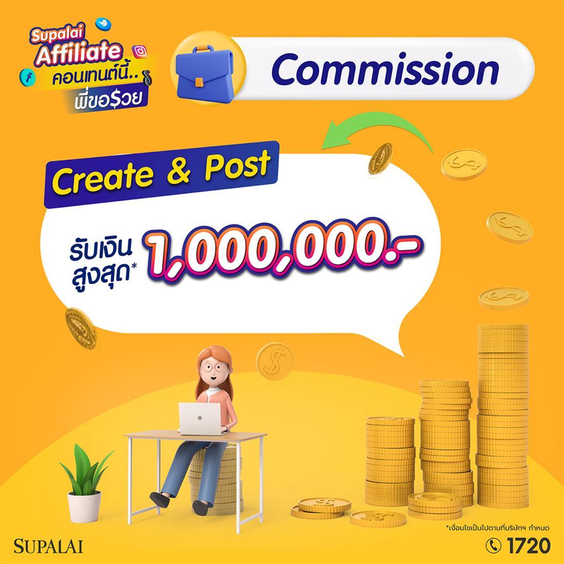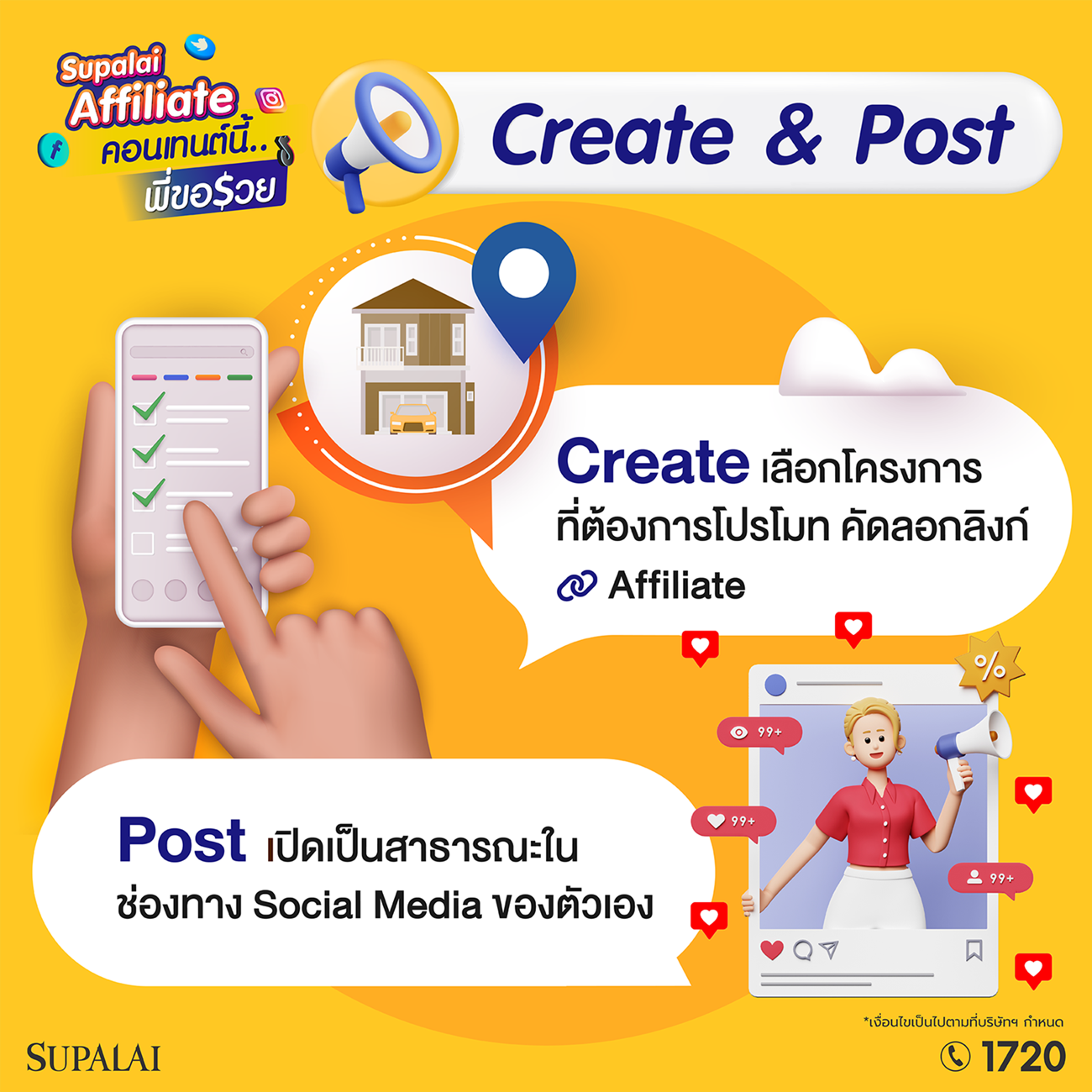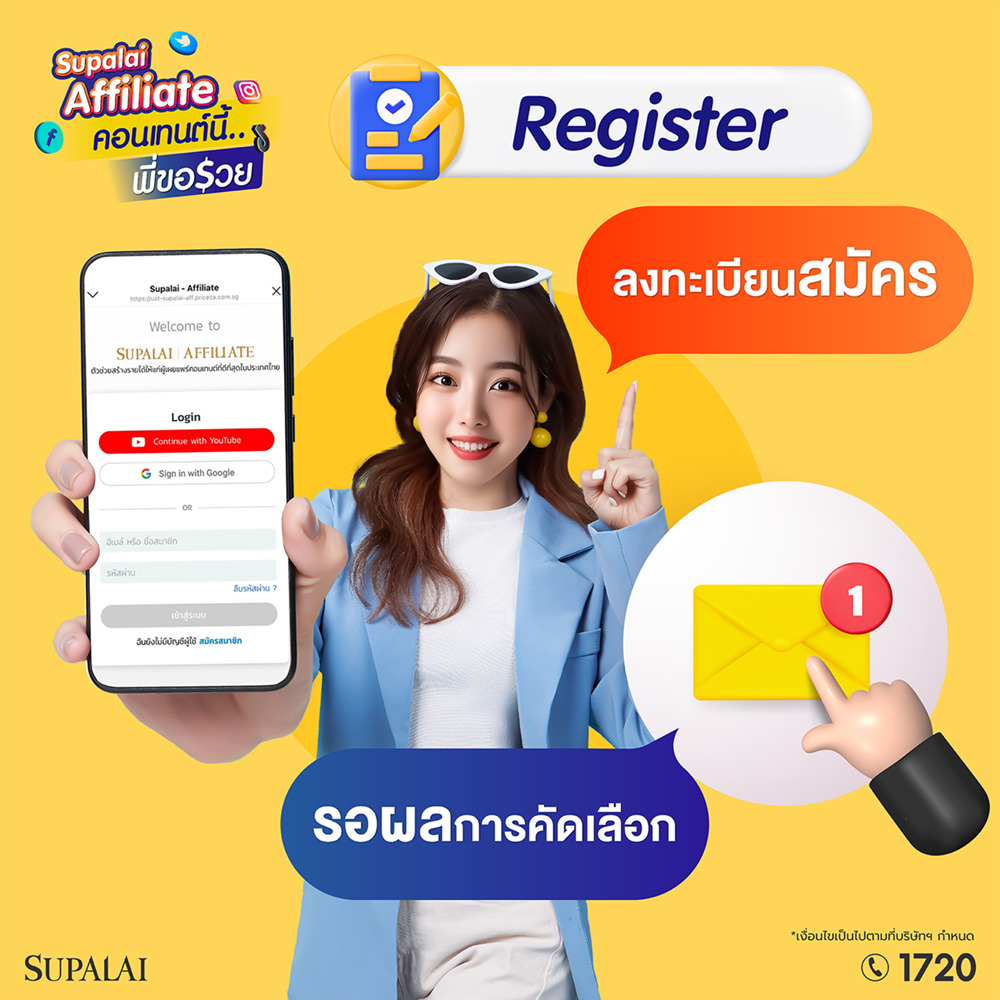 ครีเอเตอร์อย่ารอช้า! โอกาสดีๆ สร้างรายได้ง่ายๆ กับแคมเปญ “Supalai Affiliate คอนเทนต์นี้…พี่ขอรวย” สนใจสมัครเข้าร่วมแคมเปญได้ที่ https://www.supalai.com/affiliate/ ตั้งแต่วันนี้ – 30 ธันวาคม 2567 และสอบถามรายละเอียดเพิ่มเติม โทร.1720
