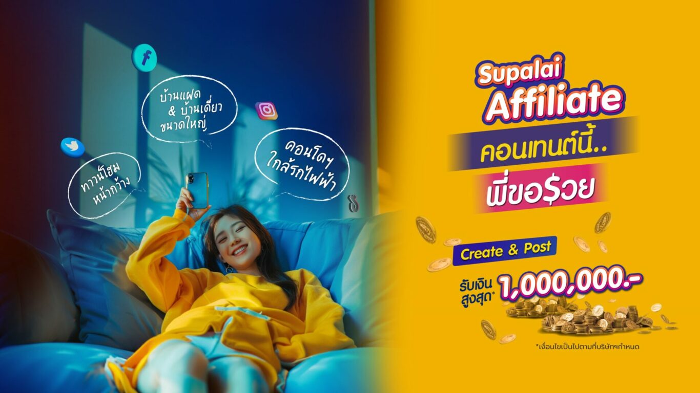 พร้อมรวยไปกับ Supalai Affiliate หรือยัง? บมจ.ศุภาลัย ชวนเหล่าคอนเทนต์ครีเอเตอร์ ที่ชอบรีวิว ชอบทำคลิป สร้างคอนเทนต์เก่งๆ ที่กำลังมองหารายได้สุดปัง ร่วมแคมเปญ “Supalai Affiliate คอนเทนต์นี้…พี่ขอรวย” เพียงแค่สร้างสรรค์คอนเทนต์โดนใจ นำเสนอในสไตล์ของคุณ กับโครงการบ้านและคอนโดมิเนียม รวม 53 โครงการ ทั้งในกรุงเทพฯ และปริมณฑล เพียงโพสต์ & แชร์ ผ่านช่องทางออนไลน์ รับเลยค่าคอมมิชชันสูงสุดถึง 1 ล้านบาท* อย่ารอช้า! รีบสมัครเข้าร่วม Supalai Affiliate ยิ่งโพสต์ ยิ่งรวย ยิ่งแชร์ ยิ่งปัง ตั้งแต่วันนี้ – 30 ธ.ค. 67 เท่านั้น