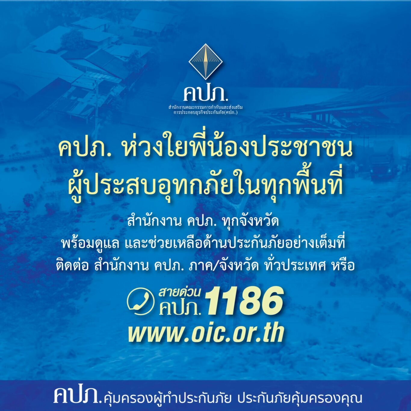 จากกรณีพื้นที่หลายจังหวัดทางภาคเหนือของประเทศไทย ได้ประสบอุทกภัย น้ำท่วมฉับพลัน น้ำป่าไหลหลาก ส่งผลให้ประชาชนได้รับผลกระทบต่อชีวิต ทรัพย์สิน บ้านเรือน รถยนต์ และพืชผลทางการเกษตรได้รับความเสียหายเป็นจำนวนมาก สำนักงานคณะกรรมการกำกับและส่งเสริมการประกอบธุรกิจประกันภัย (สำนักงาน คปภ.) ได้ติดตามสถานการณ์ดังกล่าวอย่างใกล้ชิด และมีความห่วงใยต่อความปลอดภัยในชีวิตและทรัพย์สินของพี่น้องประชาชน
