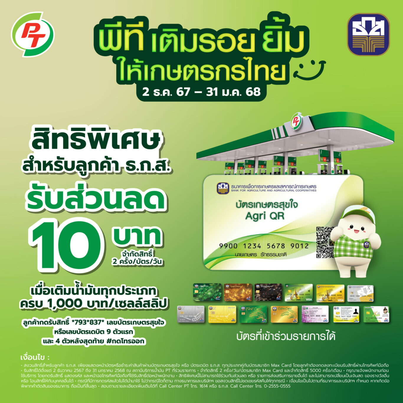 ธนาคารเพื่อการเกษตรและสหกรณ์การเกษตร (ธ.ก.ส.) ร่วมกับ บริษัท แมกซ์ โซลูชัน เซอร์วิส จำกัด จัดแคมเปญสุดพิเศษ เพื่อช่วยแบ่งเบาภาระค่าใช้จ่ายให้ลูกค้า ธ.ก.ส. ผู้ถือบัตรเกษตรสุขใจ หรือบัตรเดบิต ธ.ก.ส. ทุกประเภท คู่กับบัตรสมาชิก Max Card รับสิทธิพิเศษเมื่อเติมน้ำมัน และชำระค่าน้ำมันทุกประเภทตั้งแต่ 1,000 บาทขึ้นไป/เซลล์สลิป รับส่วนลดทันที 10 บาท ณ สถานีบริการน้ำมัน PT ทุกสาขาทั่วประเทศ ตั้งแต่วันที่ 2 ธันวาคม 2567 – 31 มกราคม 2568 เพียงลูกค้ากดลงทะเบียนรับสิทธิ์ผ่านโทรศัพท์มือถือ *793*837* ตามด้วยเลขบัตรเกษตรสุขใจ หรือเดบิต ธ.ก.ส. 9 หลักแรก และ 4 หลักสุดท้าย กด # แล้วโทรออก