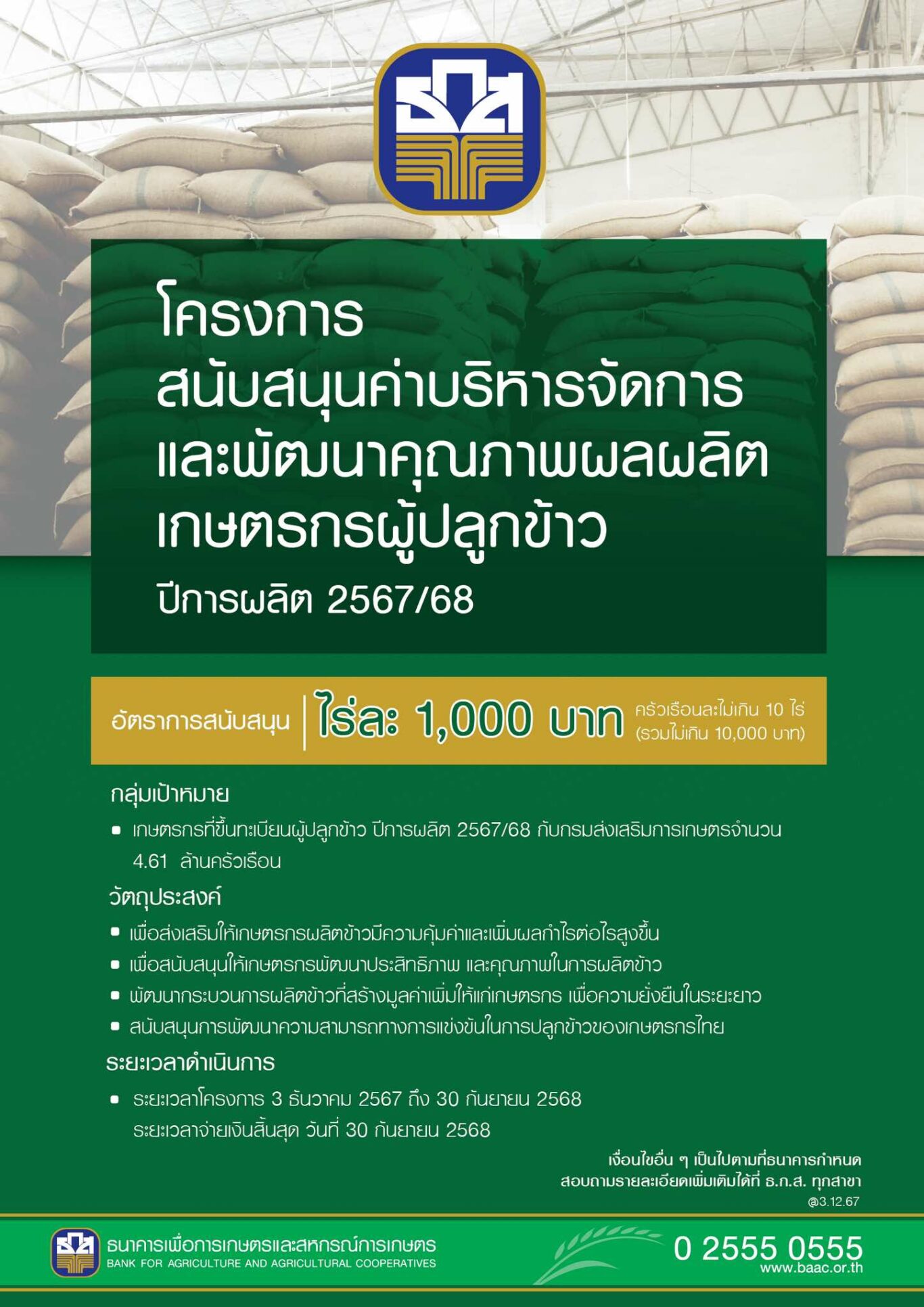 พร้อมกันนี้ คณะกรรมการ ธ.ก.ส. ยังได้มีมติเห็นชอบให้ขับเคลื่อนโครงการสนับสนุนค่าบริหารจัดการและพัฒนาคุณภาพผลผลิตเกษตรกรผู้ปลูกข้าว ปีการผลิต 2567/68 (โครงการไร่ละ 1,000 บาท ไม่เกินครัวเรือนละ 10 ไร่) ตามมติคณะรัฐมนตรี เมื่อวันที่ 3 ธันวาคม 2567 เพื่อบรรเทาความเดือดร้อนและส่งเสริมให้เกษตรมีรายได้เพียงพอต่อการดำรงชีวิต ลดค่าใช้จ่ายในการเพาะปลูกข้าว ส่งเสริมให้การผลิตข้าวมีความคุ้มค่าและเพิ่มผลกำไร โดยมีเป้าหมายเกษตรกรผู้ปลูกข้าว ปีการผลิต 2567/68 ที่ขึ้นทะเบียนกับกรมส่งเสริมการเกษตร ได้รับประโยชน์ประมาณ 4.61 ล้านครัวเรือน วงเงิน 37,414 ล้านบาท ทั้งนี้ ภายหลังจากที่ได้รับข้อมูลทะเบียนรายชื่อเกษตรกรผู้ปลูกข้าวจากกรมส่งเสริมการเกษตรแล้ว ธ.ก.ส. จะตรวจสอบข้อมูลและโอนเงินให้เกษตรกรในลำดับถัดไป