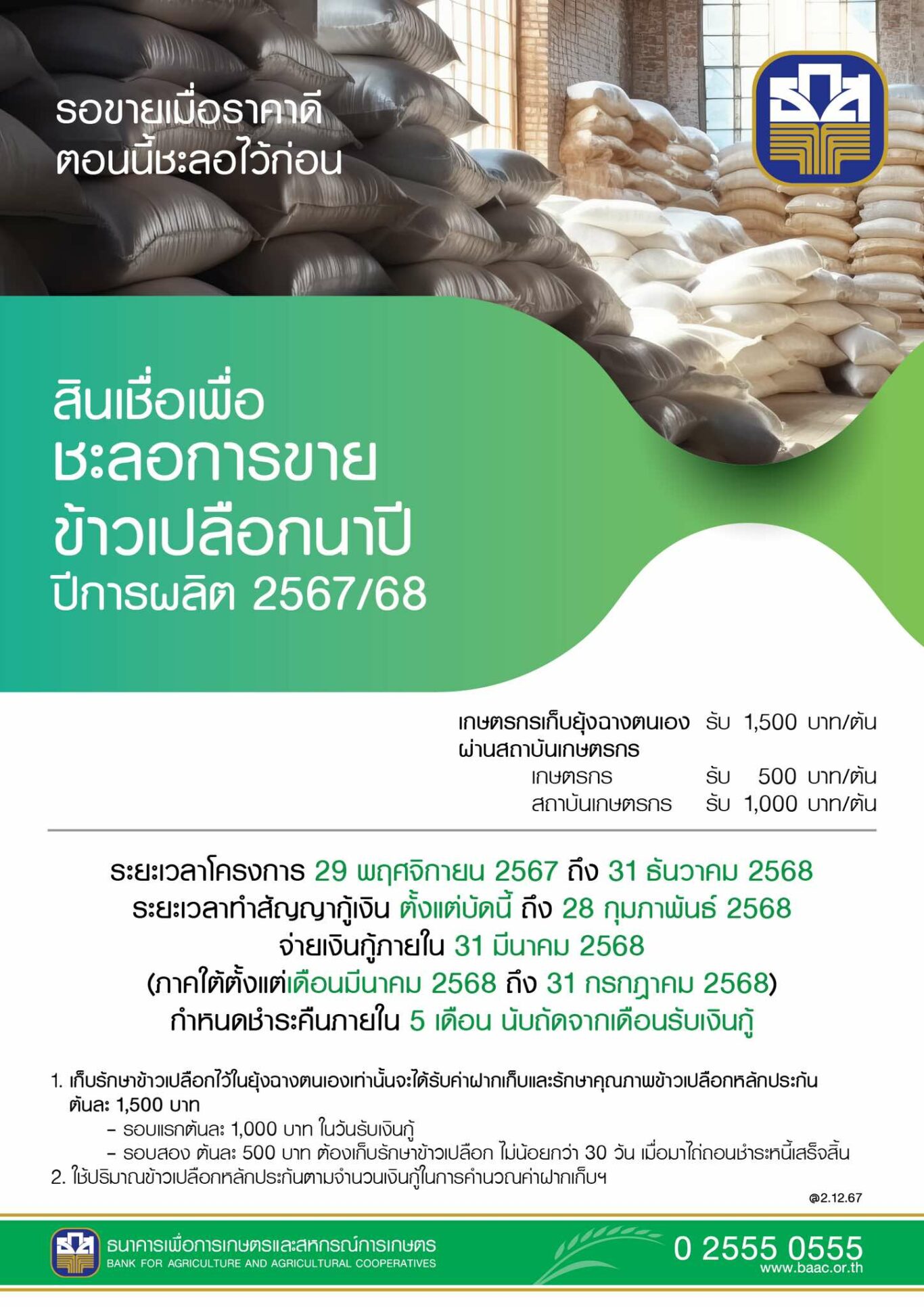 นอกจากนี้ ธ.ก.ส. ยังพร้อมสนับสนุนค่าฝากเก็บและรักษาคุณภาพข้าวเปลือกให้อีก 1,500 บาทต่อตัน กรณีเกษตรกรเก็บข้าวเองได้รับ 1,500 บาทต่อตัน กรณีเกษตรกรฝากข้าวกับสถาบันเกษตรกร เกษตรกรจะได้รับ 500 บาทต่อตัน และสถาบันฯ จะได้รับ 1,000 บาทต่อตัน ระยะเวลาจัดทำสัญญา ตั้งแต่บัดนี้ถึงวันที่ 28 กุมภาพันธ์ 2568 กรณีภาคใต้จัดทำสัญญาได้จนถึง 31 กรกฎาคม 2568 สำหรับเกษตรกรที่เข้าร่วมมาตรการพักชำระหนี้ลูกค้ารายย่อย สามารถแจ้งความประสงค์เข้าร่วมสินเชื่อชะลอการขายข้าวเปลือกนาปีได้ และเงื่อนไขอื่น ๆ เป็นไปตามที่ธนาคารกำหนด 2) สินเชื่อเพื่อรวบรวมข้าวและสร้างมูลค่าเพิ่ม โดยสถาบันเกษตรกร ปีการผลิต 2567/68 เป้าหมายรวบรวมข้าวเปลือก 1.5 ล้านตัน กรอบวงเงินรวม 15,000 ล้านบาท เพื่อสนับสนุนเงินทุนให้แก่สหกรณ์การเกษตร ชุมนุมสหกรณ์การเกษตร กลุ่มเกษตรกร วิสาหกิจชุมชนและศูนย์ข้าวชุมชนที่มีคุณสมบัติตามที่กำหนด สำหรับรับซื้อและรวบรวมข้าวจากเกษตรกรสมาชิกและเกษตรกรทั่วไป รวมถึงการนำผลผลิตไปแปรรูปจำหน่าย เพื่อสร้างมูลค่าเพิ่มให้กับผลผลิต ซึ่งจะส่งผลให้การรักษาเสถียรภาพราคาข้าวเปลือกในตลาดเป็นไปอย่างมีประสิทธิภาพ