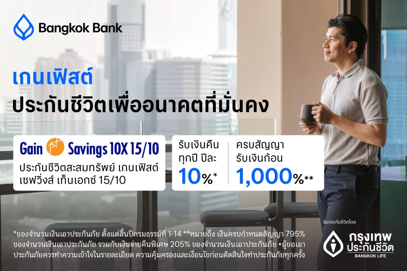 กรุงเทพประกันชีวิต จับมือ ธนาคารกรุงเทพ เปิดตัวประกันสะสมทรัพย์ใหม่ “เกนเฟิสต์ เซฟวิ่งส์ เท็นเอกซ์ 15/10” (Gain1st Saving 10X 15/10) เจาะกลุ่มคนทำงานโดยเฉพาะผู้บริหารระดับกลางถึงระดับสูง รวมทั้งเจ้าของธุรกิจรุ่นใหม่ ที่ต้องการสร้างความมั่นคงผ่านการวางแผนการเงิน ด้วยจุดเด่นจ่ายเบี้ยเพียง 10 ปี คุ้มครองถึง 15 ปี ให้ผลประโยชน์เป็นเงินคืนทุกปี ปีละ 10% ของทุนประกัน และมีเงินคืนก้อนใหญ่เมื่อครบกำหนดสัญญา ครอบคลุมความคุ้มครองชีวิต และเพิ่มเติมกรณีเสียชีวิตจากอุบัติเหตุสูงสุด 1050% รวมผลประโยชน์สูงสุด 2,100%