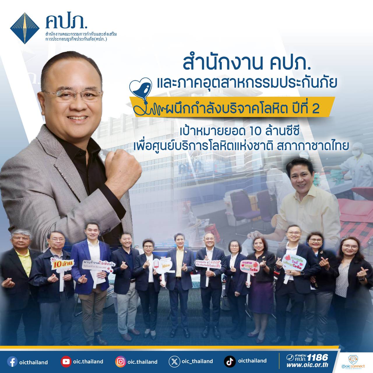 สภากาชาดไทย สำนักงานคณะกรรมการกำกับและส่งเสริมการประกอบธุรกิจประกันภัย (สำนักงาน คปภ.) และภาคอุตสาหกรรมประกันภัย ร่วมกับ ศูนย์บริการโลหิตแห่งชาติ สภากาชาดไทย จัดกิจกรรมบริจาคโลหิต “รวมพลังประกันภัย ให้โลหิต ปีที่ 2 ประจำปี 2568” ทั้งในส่วนกลางและส่วนภูมิภาคทั่วประเทศ ซึ่งเป็นส่วนหนึ่งในกิจกรรมจิตอาสาบำเพ็ญสาธารณกุศล เพื่อสนับสนุนการแก้ไขปัญหาการขาดแคลนโลหิตสำรองของสภากาชาดไทย อันเป็นประโยชน์ต่อสังคมโดยส่วนรวม อีกทั้งยังสอดคล้องกับนโยบายด้านการแสดงความรับผิดชอบต่อสังคมและสิ่งแวดล้อม หรือ CSR ของภาคอุตสาหกรรมประกันภัยไทย โดยมีคณะผู้บริหารสำนักงาน คปภ.ผู้บริหารภาคอุตสาหกรรมประกันภัย พนักงานและเจ้าหน้าที่ของสำนักงาน คปภ. รวมถึงประชาชนในพื้นที่ใกล้เคียง ร่วมบริจาคโลหิตเป็นจำนวนมาก ณ หน่วยรับบริจาคโลหิตเคลื่อนที่ ห้องประชุมชั้น 1 สถาบันวิทยาการประกันภัยระดับสูง สำนักงาน คปภ. ถนนรัชดาภิเษก เมื่อวันที่ 24 มีนาคม 2568