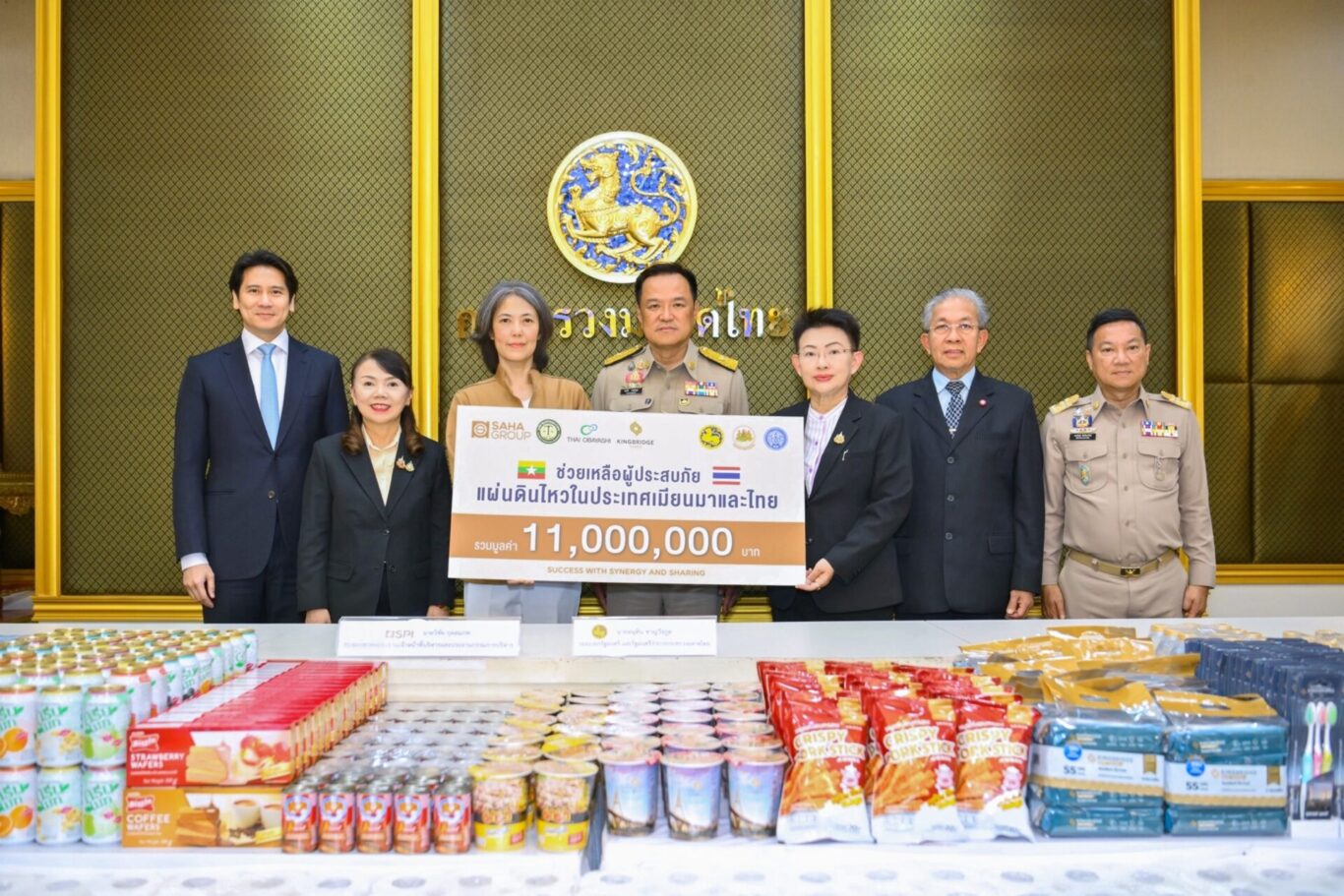 กระทรวงมหาดไทย: นายอนุทิน ชาญวีรกูล รองนายกรัฐมนตรีและรัฐมนตรีว่าการกระทรวงมหาดไทย รับมอบผลิตภัณฑ์อุปโภคบริโภคแบรนด์ “คิงบริดจ์” และผลิตภัณฑ์เครือสหพัฒน์ มูลค่ารวม 5,000,000 บาท จาก นายวิชัย กุลสมภพ ประธานกรรมการบริหารและประธานเจ้าหน้าที่บริหาร บริษัท สหพัฒนาอินเตอร์โฮลดิ้ง จำกัด (มหาชน) หรือ SPI และ กรรมการผู้จัดการ บริษัท คิงบริดจ์ ทาวเวอร์ จำกัด พร้อมด้วย นางสาวธนินธร โชควัฒนา ผู้อำนวยการสำนักสื่อสารองค์กรและธรรมาภิบาล บริษัท สหพัฒนาอินเตอร์โฮลดิ้ง จำกัด (มหาชน) หรือ SPI และ ผู้อำนวยการโครงการคิงบริดจ์ ทาวเวอร์ ตัวแทนจากกลุ่ม 4 พันธมิตร: เครือสหพัฒน์, มูลนิธิดร.เทียม โชควัฒนา, อาคารคิงบริดจ์ ทาวเวอร์ และ บริษัท นันทวัน จำกัด (Thai Obayashi Corporation Limited) เพื่อนำไปช่วยหลือบรรเทาความเดือดร้อนของผู้ประสบภัย รวมถึงทีมกู้ภัยที่ช่วยค้นหาผู้ประสบภัยจากเหตุแผ่นดินไหว เมื่อเร็วๆ นี้