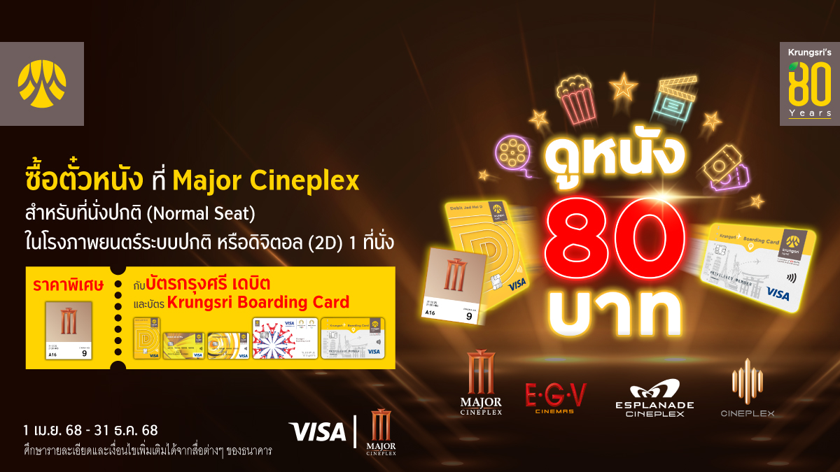 กรุงเทพฯ (18 เมษายน 2568) – กรุงศรี (ธนาคารกรุงศรีอยุธยา จำกัด (มหาชน)) ฉลองครบรอบ 80 ปี มอบสิทธิพิเศษสำหรับผู้ถือบัตรกรุงศรี เดบิต ทุกประเภท และบัตร Krungsri Boarding Card ซื้อตั๋วหนังราคาพิเศษที่ Major Cineplex เพียง 80 บาท สำหรับที่นั่งปกติ (Normal Seat) ในโรงภาพยนตร์ระบบปกติ หรือดิจิตอล (2D) 1 ที่นั่ง (เฉพาะสาขาที่ร่วมรายการ) เพียงชำระเงินด้วยบัตรกรุงศรี เดบิต ทุกประเภท และบัตร Krungsri Boarding Card ผ่านเครื่องจำหน่ายตั๋วอัตโนมัติ (E-Ticket) ตั้งแต่วันที่ 1 เมษายน 2568 – 31 ธันวาคม 2568