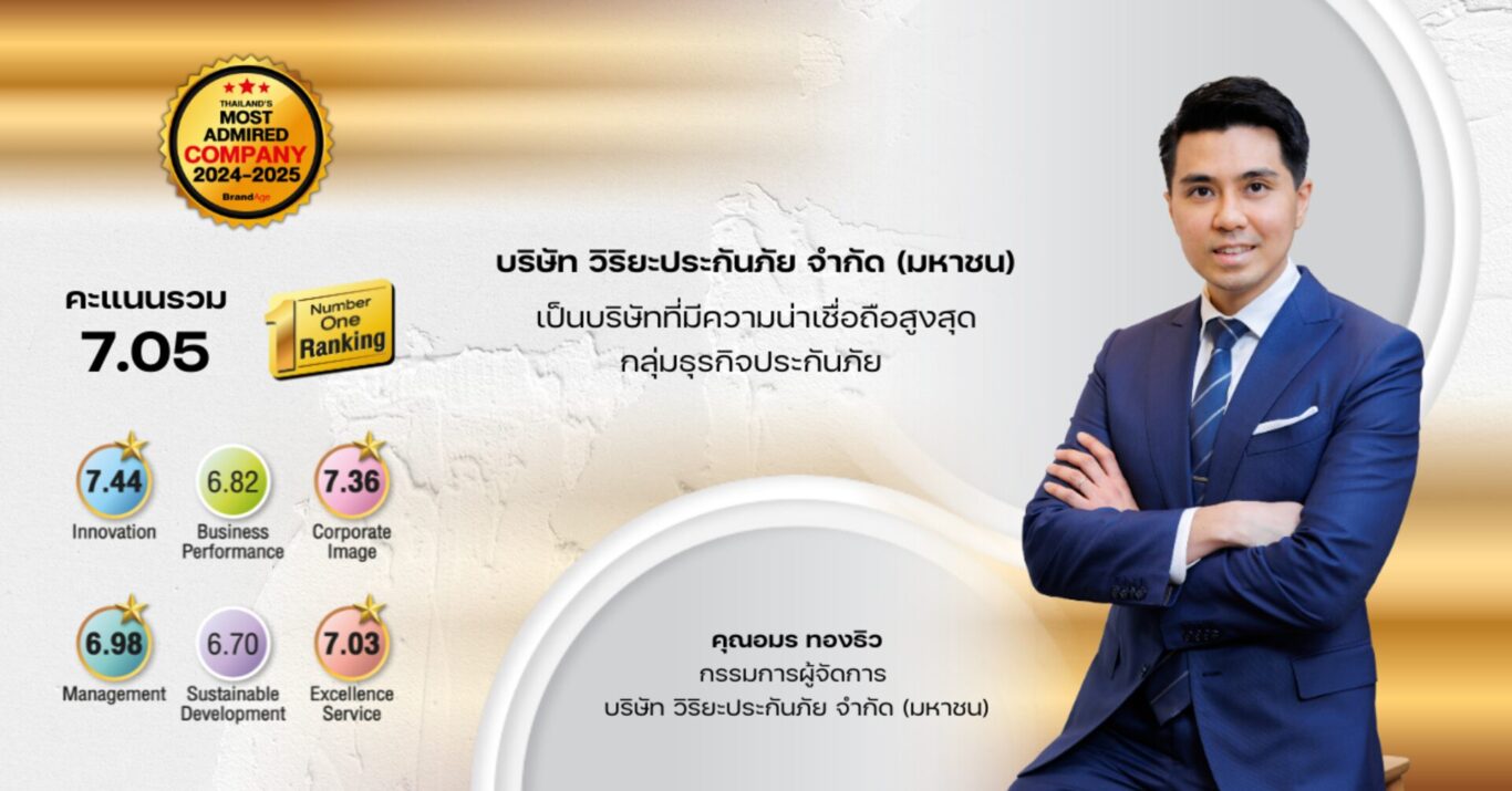 นายอมร ทองธิว กรรมการผู้จัดการ บริษัท วิริยะประกันภัย จำกัด (มหาชน) รับรางวัล “2025 Thailand’s Most Admired Brand” ตอกย้ำฐานะผู้นำธุรกิจประกันภัยอันดับ 1 ต่อเนื่องเป็นปีที่ 22 พร้อมกันนี้ บริษัทฯ ยังได้รับรางวัล “2024-2025 Thailand’s Most Admired Company” ต่อเนื่องเป็นปีที่ 3 สะท้อนถึงความน่าเชื่อถือและความไว้วางใจจากผู้บริโภคที่มีต่อวิริยะประกันภัย ในฐานะองค์กรชั้นนำของอุตสาหกรรมประกันภัยไทย โดยพิธีมอบรางวัลจัดขึ้น ณ โรงแรมพูลแมน คิง เพาเวอร์ กรุงเทพ