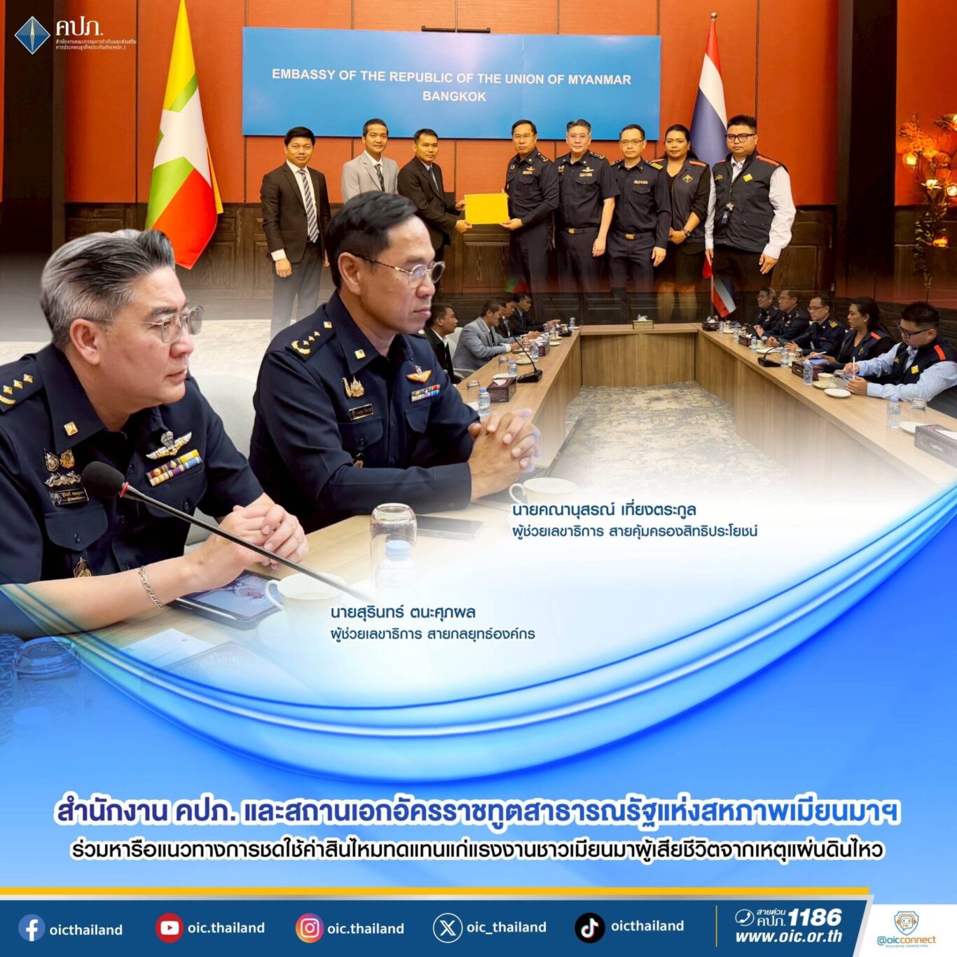 เมื่อวันจันทร์ที่ 21 เมษายน 2568 นายสุรินทร์ ตนะศุภผล ผู้ช่วยเลขาธิการ สายกลยุทธ์องค์กร และ นายคณานุสรณ์ เที่ยงตระกูล ผู้ช่วยเลขาธิการ สายคุ้มครองสิทธิประโยชน์ พร้อมด้วยคณะเจ้าหน้าที่จากสำนักงานคณะกรรมการกำกับและส่งเสริมการ ประกอบธุรกิจประกันภัย (สำนักงาน คปภ.) ได้เดินทางไปยังสถานเอกอัครราชทูตสาธารณรัฐแห่งสหภาพเมียนมาประจำประเทศไทย เข้าพบ Mr.Yan Naung Deputy Director Labour Attache Office เพื่อหารือแนวทางการใช้ค่าสินไหมทดแทนให้แก่บุคคล สัญชาติเมียนมาที่เสียชีวิตจากเหตุอาคารสำนักงานการตรวจเงินแผ่นดิน (สตง.) ถล่ม อันเนื่องมาจากเหตุแผ่นดินไหวเมื่อวันที่ 28 มีนาคม 2568