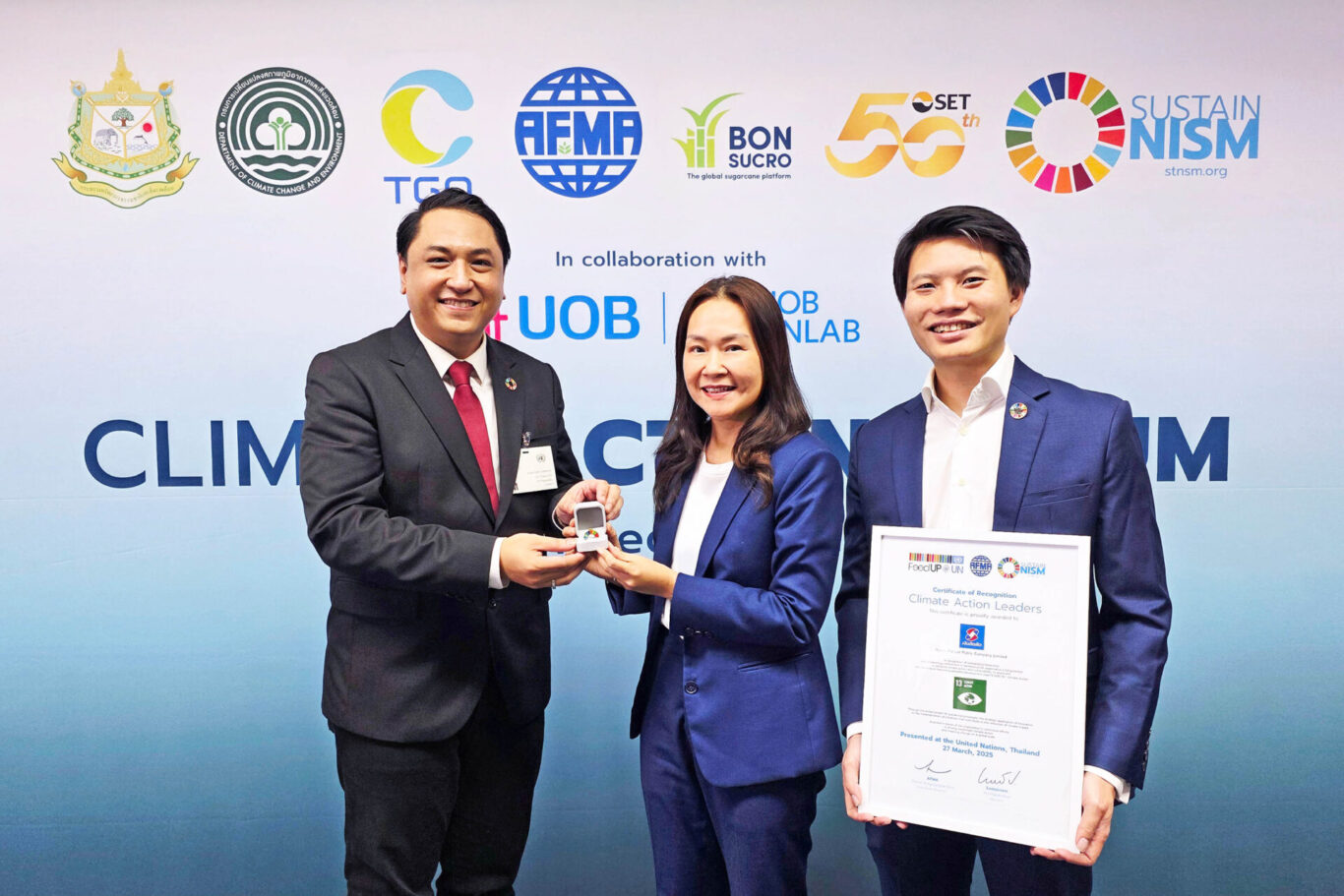 บริษัท เงินติดล้อ จำกัด (มหาชน) หรือ TIDLOR โดย นิภา วนิชวัฒน์ (กลาง) ผู้บริหารระดับสูง สายงานกิจกรรมเพื่อสังคม รับมอบประกาศนียบัตร “Climate Action Leaders Recognition” ในฐานะผู้นำความยั่งยืนในภารกิจการฟื้นฟูสภาพภูมิอากาศและสิ่งแวดล้อม จากองค์การระหว่างประเทศในระดับรัฐบาล AFMA (Agricultural and Food Marketing Association for Asia and the Pacific – UN FAO) ร่วมกับ Sustainism เครือข่ายความร่วมมือเพื่อการพัฒนาอย่างยั่งยืน ซึ่งแสดงถึงการเป็นองค์กรพันธมิตรด้านความยั่งยืนของ Sustainism (stnsm.org) ร่วมกับองค์กรจากหลากหลายภาคส่วนทั้งหมด 50 องค์กร ภายในงาน Climate Action Forum ประจำปี 2568 ณ องค์การสหประชาชาติ ประจำประเทศไทย