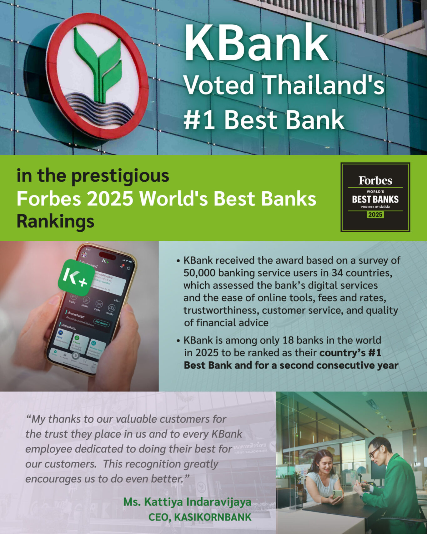 กสิกรไทย ครองแชมป์ธนาคารอันดับ 1 ของประเทศไทย จากการจัดอันดับ “World’s Best Banks 2025” โดยนิตยสาร Forbes หนึ่งในเพียง 18 ธนาคารทั่วโลกที่รักษาอันดับ 1 ในประเทศ และได้ต่อเนื่องสองปีซ้อนForbes หนึ่งในสื่อธุรกิจชั้นนำระดับโลก ประกาศผลการจัดอันดับ World’s Best Banks 2025 ซึ่งธนาคารกสิกรไทยได้รับการยกย่องให้เป็น “ธนาคารที่ดีที่สุดของประเทศไทย”