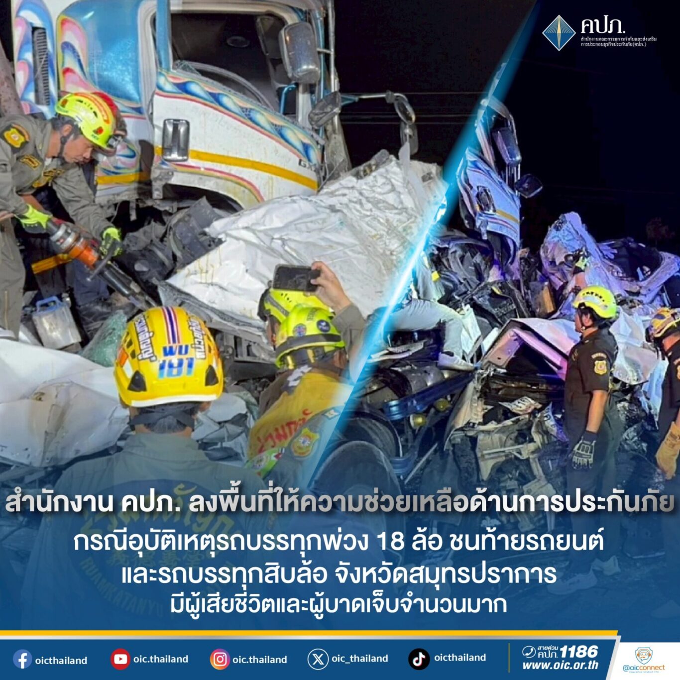 สำนักงาน คปภ. ลงพื้นที่ตรวจสอบและให้ความช่วยเหลือด้านประกันภัย กรณีอุบัติเหตุรถบรรทุกพ่วง 18 ล้อ ชนท้ายรถยนต์และรถบรรทุกสิบล้อ จังหวัดสมุทรปราการ มีผู้เสียชีวิตและบาดเจ็บจำนวนมาก