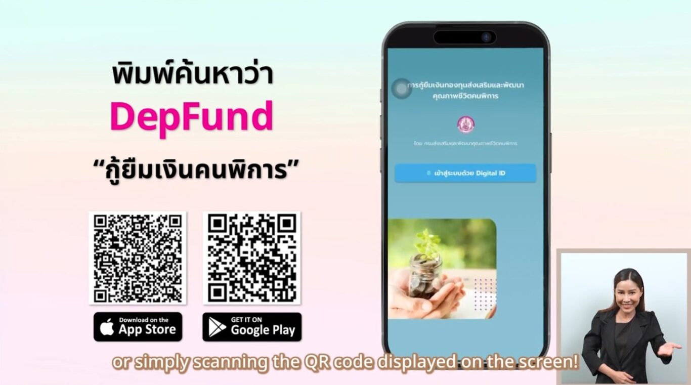 ซึ่งแอปพลิเคชัน DepFund รองรับทั้งระบบปฏิบัติการ IOS และ Android สามารถเข้าใช้งานผ่าน DIGITAL ID โดยให้บริการตรวจสอบผลการอนุมัติการกู้ยืมเงิน ตรวจสอบยอดคงเหลือ และประวัติการชำระเงิน และที่สำคัญ สามารถชำระหนี้ผ่าน QR Code ได้ด้วย ทั้งสะดวก รวดเร็ว ซึ่งเหมาะสำหรับคนพิการหรือผู้ดูแลคนพิการที่ได้ทำสัญญากู้ยืมเงินแล้ว