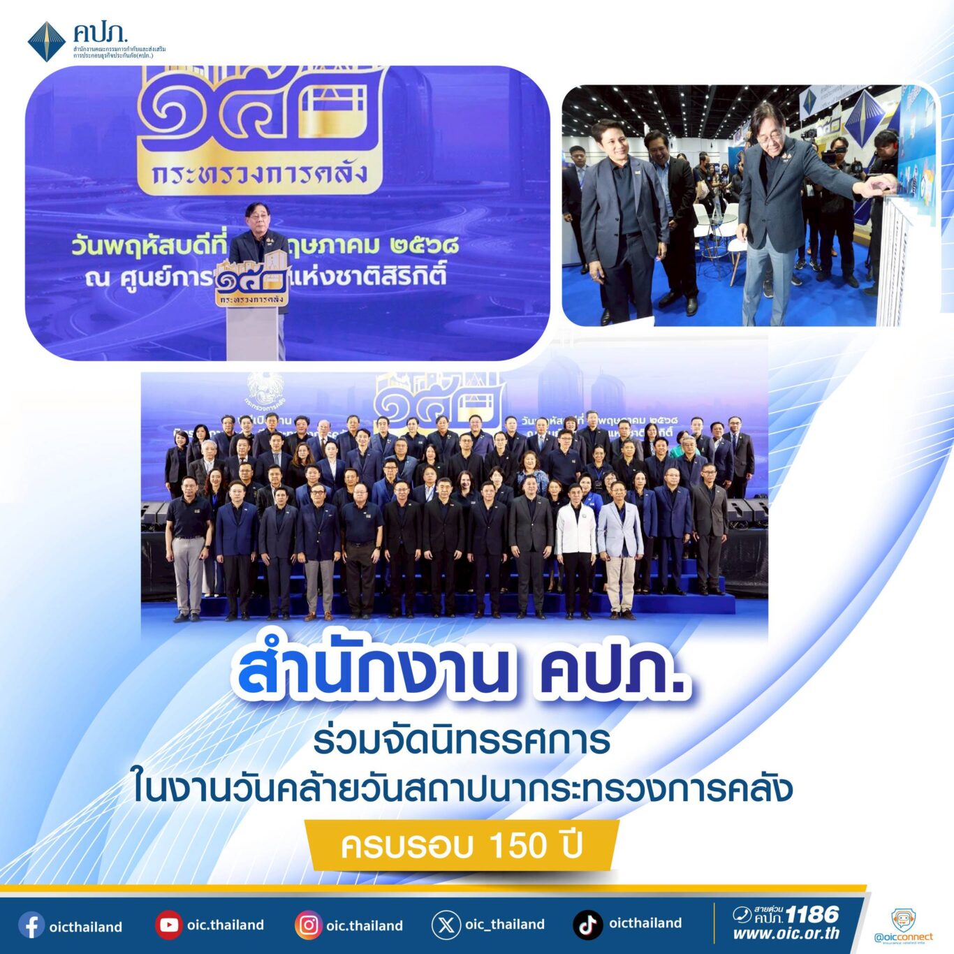 สำนักงานคณะกรรมการกำกับและส่งเสริมการประกอบธุรกิจประกันภัย (สำนักงาน คปภ.) ได้เข้าร่วมจัดนิทรรศการในงานวันคล้ายวันสถาปนากระทรวงการคลัง ครบรอบ 150 ปี ระหว่างวันที่ 1-3 พฤษภาคม 2568 ณ Hall 3-4 ชั้น G ศูนย์การประชุมแห่งชาติสิริกิติ์ งานวันคล้ายวันสถาปนากระทรวงการคลัง ครบรอบ 150 ปี จัดขึ้นภายใต้แนวคิด “MOF JOURNEY 150 ปี เส้นทางการคลังไทย” โดยมี นายพิชัย ชุณหวชิร รองนายกรัฐมนตรีและรัฐมนตรีว่าการกระทรวงการคลัง เป็นประธานในพิธี โดยมี นางสาววสุมดี วสีนนท์ รองเลขาธิการ ด้านกำกับคนกลางและประกันภัยภูมิภาค สำนักงาน คปภ. เป็นผู้แทนเข้าร่วมพิธีเปิดงาน