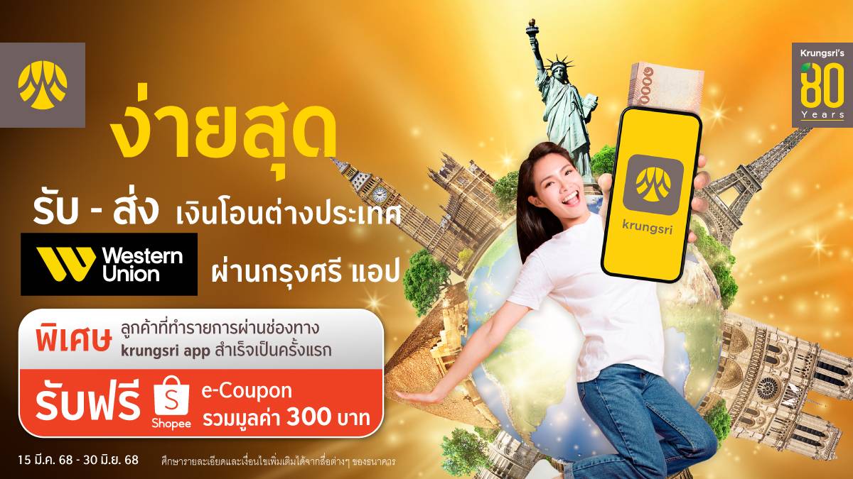 (2 พฤษภาคม 2568) – กรุงศรี (ธนาคารกรุงศรีอยุธยา จำกัด (มหาชน)) มอบสิทธิพิเศษสำหรับลูกค้าที่ทำรายการรับ-ส่งเงินโอนต่างประเทศ Western Union ผ่านช่องทาง krungsri app สำเร็จเป็นครั้งแรก ตามเงื่อนไขที่ธนาคารกำหนด รับ Shopee e-Coupon รวมมูลค่า 300 บาท ตั้งแต่วันที่ 15 มีนาคม 2568 – 30 มิถุนายน 2568