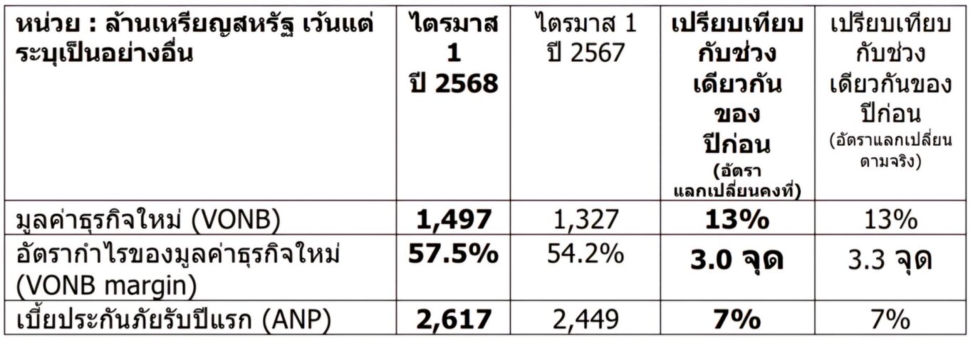 •มูลค่าธุรกิจใหม่ (VONB) เติบโตร้อยละ 13 อยู่ที่ 1,497 ล้านเหรียญสหรัฐ