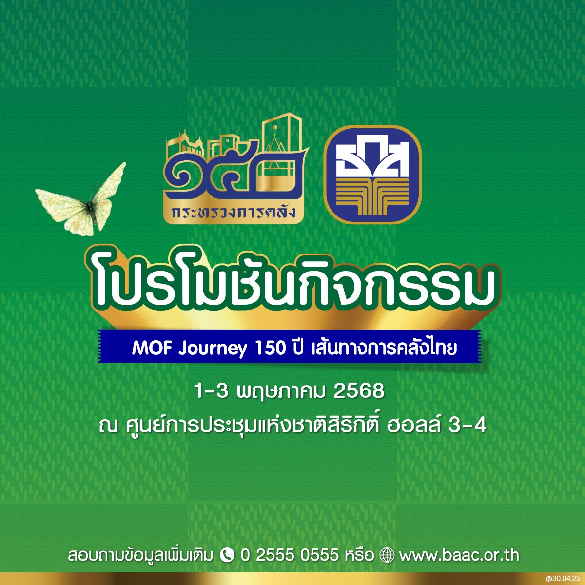 งาน MOF Journey 150 ปี เส้นทางการคลังไทย จะจัดขึ้นระหว่างวันที่ 1 – 3 พฤษภาคม 2568 ณ Hall 3 – 4 ศูนย์การประชุมแห่งชาติสิริกิติ์ กรุงเทพฯ สอบถามรายละเอียดเพิ่มเติมที่ Call Center 02 555 0555