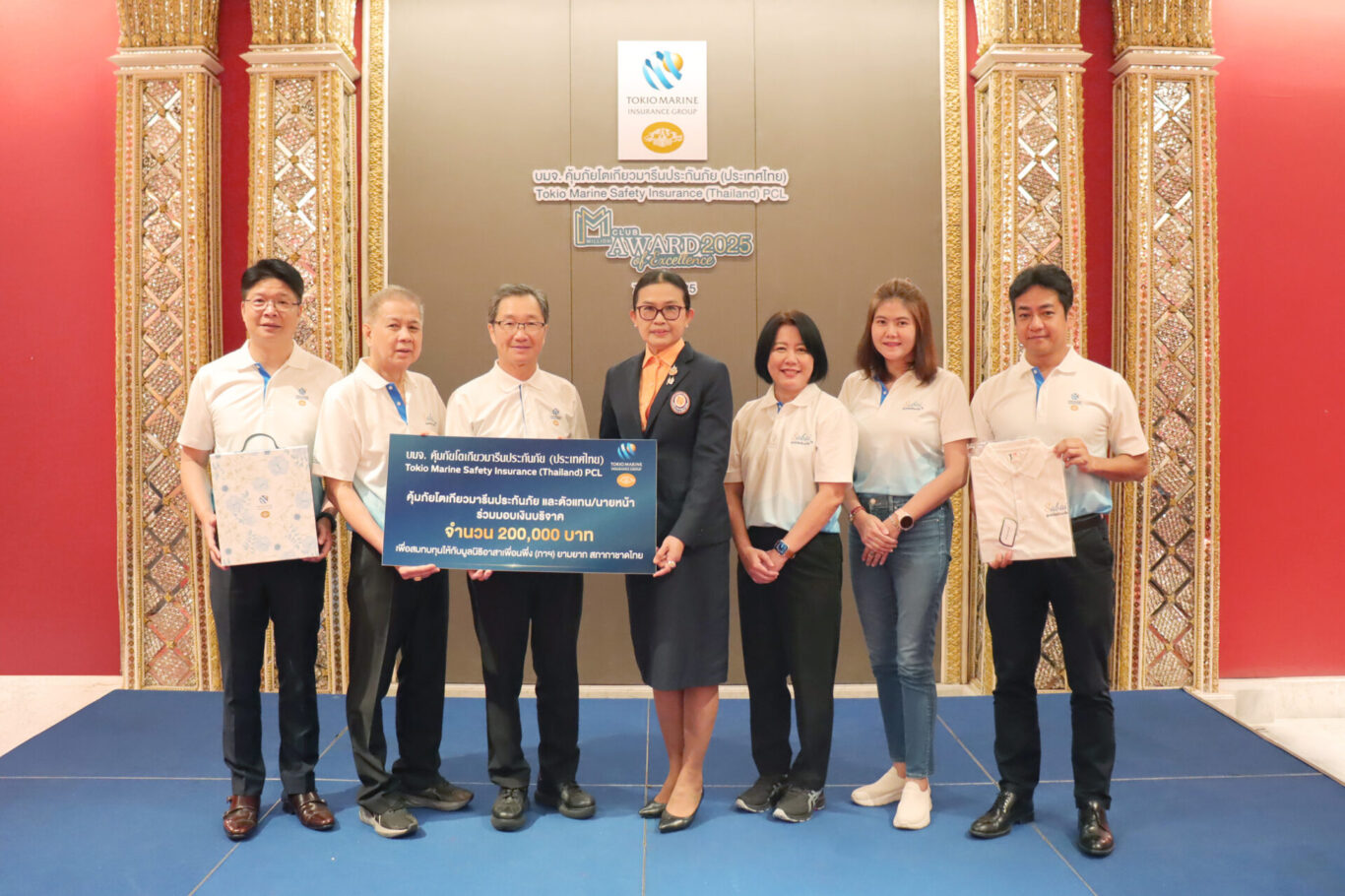 บริษัท คุ้มภัยโตเกียวมารีนประกันภัย (ประเทศไทย) จำกัด (มหาชน) นำโดย สุธีชัย สันติวราคม ประธานเจ้าหน้าที่บริหารและกรรมการผู้จัดการ (ลำดับที่ 3 จากซ้าย) ร่วมด้วย โนบุฟูมิ ยาซุเอะ ประธานเจ้าหน้าที่บริหาร (ลำดับที่ 1 จากขวา) และ เสรี กวินรัชตโรจน์ รองประธานเจ้าหน้าที่บริหาร (ลำดับที่ 1 จากซ้าย) พร้อมด้วยบริษัทคู่ค้า / ตัวแทน ร่วมกันมอบเงินที่ระดมได้โครงการ “สบายใจได้ช่วย ‘เพื่อน’” จำนวน 200,000 บาท แก่ มูลนิธิอาสาเพื่อนพึ่ง (ภาฯ) ยามยาก สภากาชาดไทย โดยมี มณฑิชา สุขจันทร์ ผู้ช่วยผู้จัดการมูลนิธิ สายงานพัฒนาความยั่งยืนและกิจกรรมเพื่อสังคม เป็นผู้รับมอบ ณ ห้องมณเฑียรทิพย์ โรงแรมมณเฑียร เมื่อวันพุธที่ 7 พฤษภาคม 2568